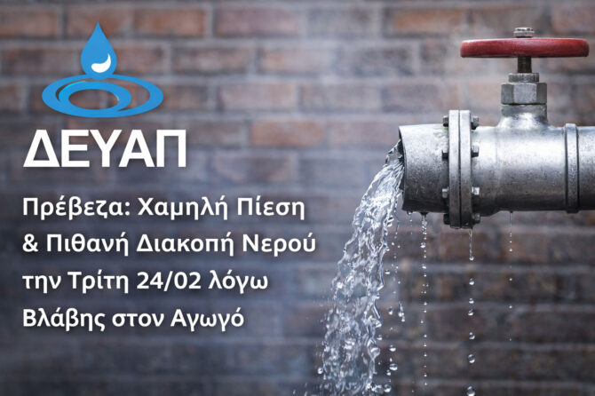 Πρέβεζα: Χαμηλή Πίεση & Πιθανή Διακοπή Νερού την Τρίτη 24/02 λόγω Βλάβης στον Αγωγό