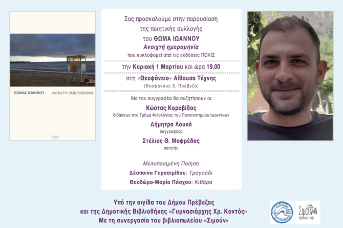 Την Κυριακή 1 Μαρτίου στην Πρέβεζα η παρουσίαση της νέας ποιητικής συλλογής του Θωμά Ιωάννου «Ανοιχτή ημερομηνία»