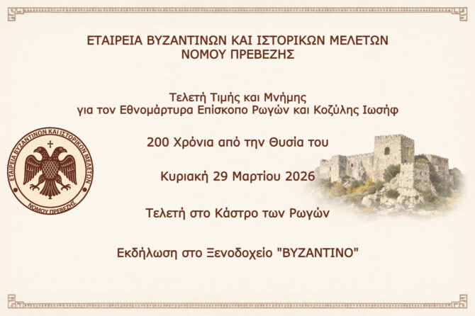 ΕΤΑΙΡΕΙΑ ΒΥΖΑΝΤΙΝΩΝ ΚΑΙ ΙΣΤΟΡΙΚΩΝ ΜΕΛΕΤΩΝ ΝΟΜΟΥ ΠΡΕΒΕΖΗΣ – Με την ευλογία και τον χαιρετισμό του Μακαριωτάτου Αρχιεπισκόπου κ.κ. Ιερωνύμου, η Τελετή Τιμής και Μνήμης για τον Εθνομάρτυρα Επίσκοπο Ρωγών και Κοζύλης Ιωσήφ
