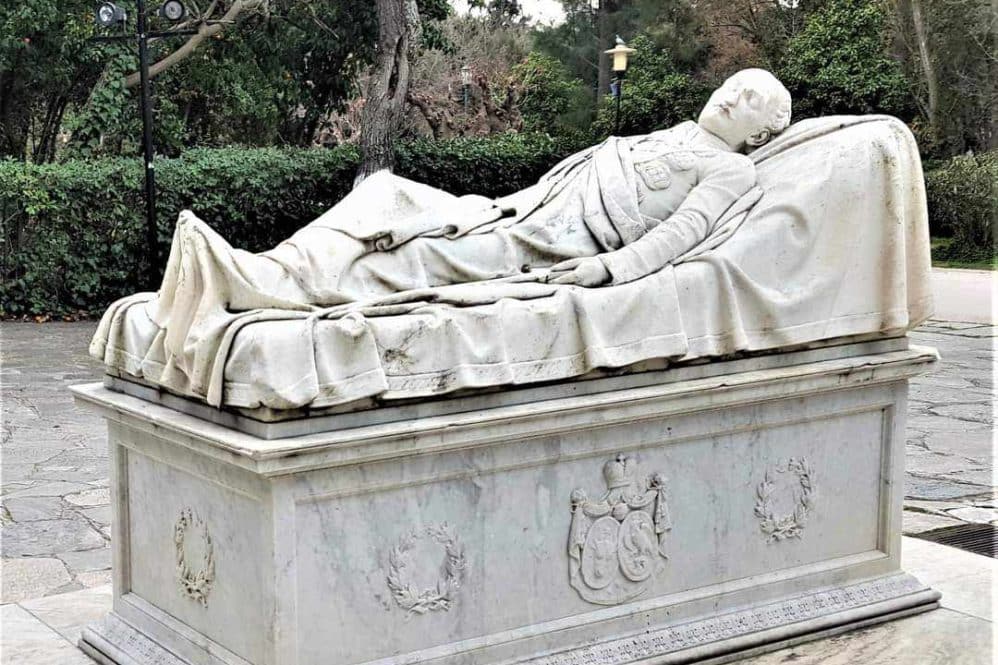 Το Κλασικιστικού Τύπου μνημείο είναι μοναδικό παράδειγμα «κοιμώμενης» επί σαρκοφάγου ανδρικής μορφής στην Ελλάδα και αποδίδεται στον γλύπτη Λεωνίδα Δρόση.