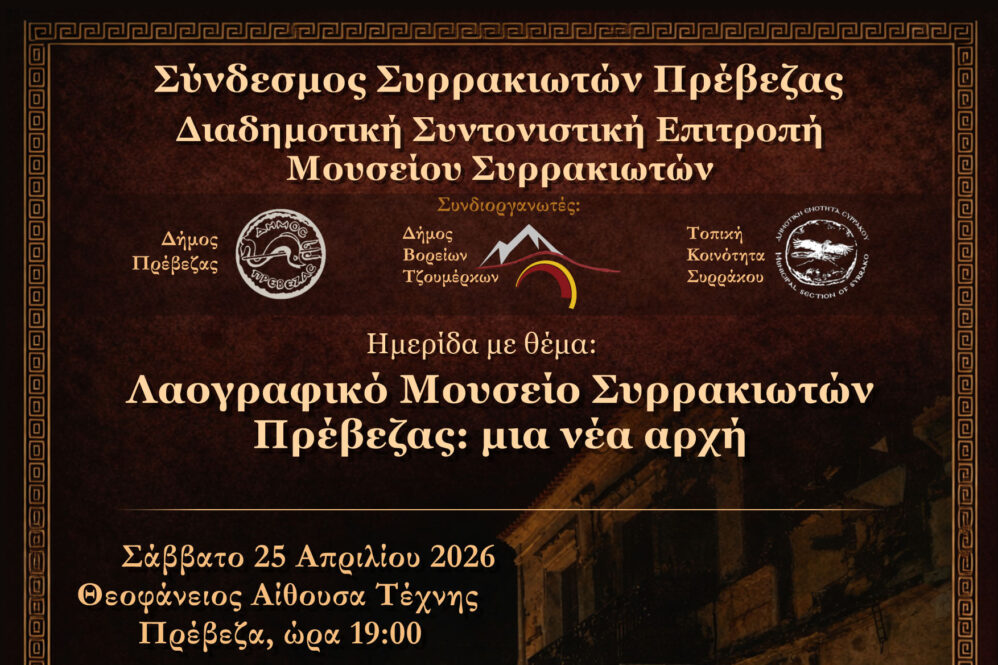Οι Δήμοι Πρέβεζας και Βορείων Τζουμέρκων, η Τοπική Κοινότητα Συρράκου, ο Σύνδεσμος Συρρακιωτών Πρέβεζας και η Διαδημοτική Συντονιστική Επιτροπή Μουσείου Συρρακιωτών Πρέβεζας συνδιοργανώνουν: