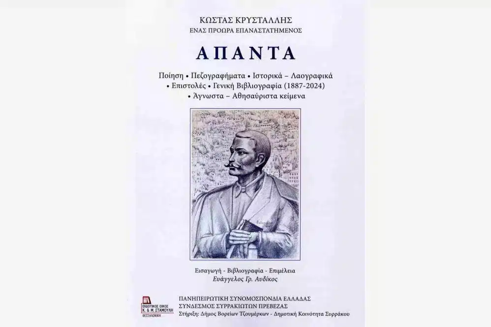 Τον νέο τόμο Απάντων του ποιητή Κώστα Κρυστάλλη παρουσιάζει στην Πρέβεζα ο Σύνδεσμος Συρρακιωτών Πρέβεζας, σε συνδιοργάνωση με τον Δήμο Πρέβεζας. Την Περιφέρεια Ηπείρου/Περιφερειακή Ενότητα Πρέβεζας, τον Δήμο Βορείων Τζουμέρκων, την Δημοτική Κοινότητα Συρράκου, το Θερινό Σχολείο Τζουμέρκων/ΟΜΑΠΙ , τον Πολιτιστικό Σύλλογο «Πρέβεζα», τον Εκδοτικό Οίκο  Κ. & Μ. Σταμούλη και το Βιβλιοπωλείο Bookshop.
