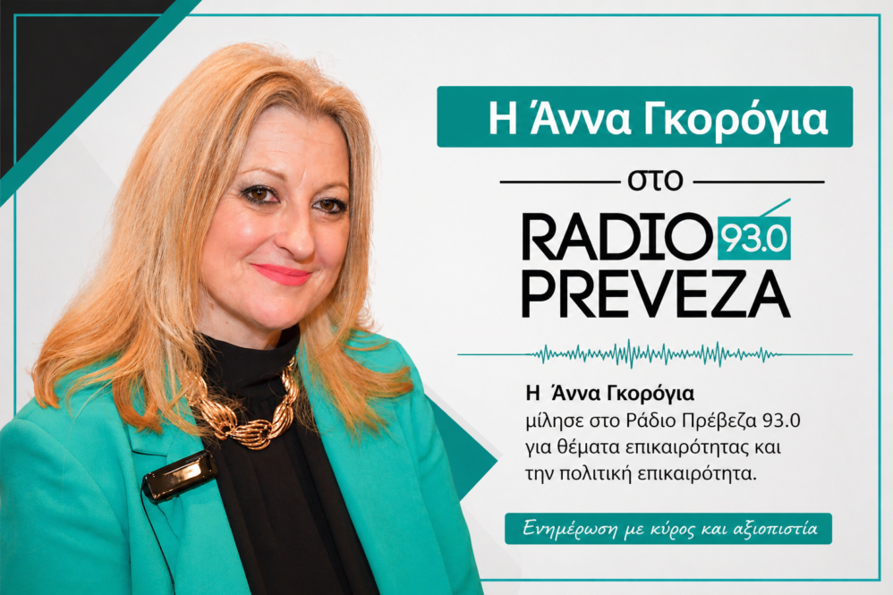Σε μια ουσιαστική και ήπια πολιτική τοποθέτηση προχώρησε η Άννα Γκορόγια, πρώην μέλος της Νομαρχιακής Επιτροπής ΠΑΣΟΚ και συντονίστρια στο νομό Πρέβεζας, μιλώντας στο Ράδιο Πρέβεζα 93 και στην εκπομπή «ΕΝΗΜΕΡΩΣΗ» με τον Γιάννη Βασιλειάδη, το απόγευμα της Δευτέρας.