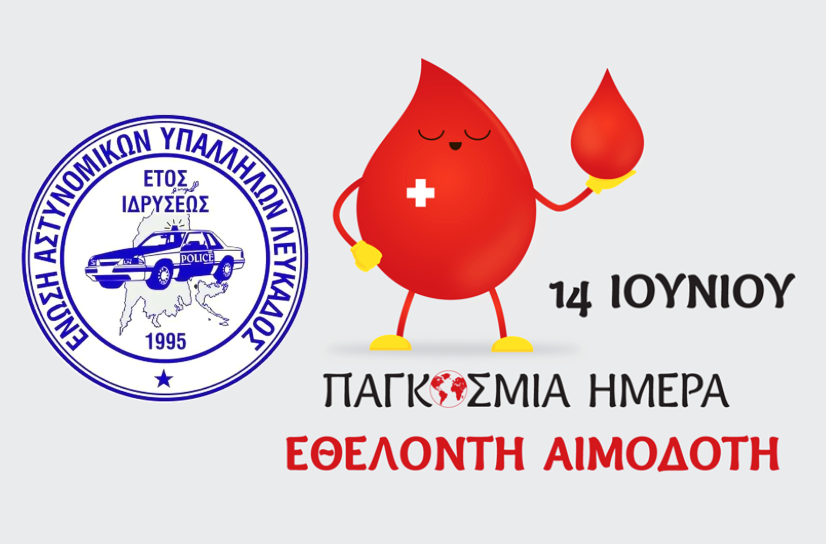 Η Ένωση Αστυνομικών Υπαλλήλων Λευκάδας με αφορμή την παγκόσμια ημέρα εθελοντή αιμοδότη, 14 Ιουνίου, και με υψηλό το αίσθημα της κοινωνικής ευθύνης και προσφοράς, προσκαλεί όλα τα μέλη και συναδέλφους της να προσέρχονται καθόλη τη διάρκεια της εβδομάδας έως και το Σάββατο 14/06 και κατά το ωράριο αιμοδοσίας, καθημερινές: 8:30’-13:30’, απόγευμα: 19:00’-20:30’ και Σάββατο 11:00’ -13:00’ στο Τμήμα Αιμοδοσίας του Γ.Ν. Νοσοκομείου Λευκάδας και να αφιερώσουμε λίγα λεπτά από το χρόνο μας στηρίζοντας με αυτό τον τρόπο τους συνανθρώπους μας που έχουν ή θα τους προκύψει πραγματική ανάγκη έστω για μια φιάλη αίμα.