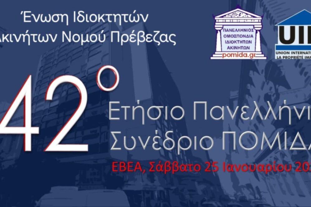 Το Διοικητικό Συμβούλιο της Π.ΟΜ.ΙΔ.Α. (Πανελλήνια Ομοσπονδία Ιδιοκτητών Ακινήτων),διοργανώνει το 42o ετήσιο ΠΑΝΕΛΛΗΝΙΟ ΣΥΝΕΔΡΙΟ της στην Αθήνα.