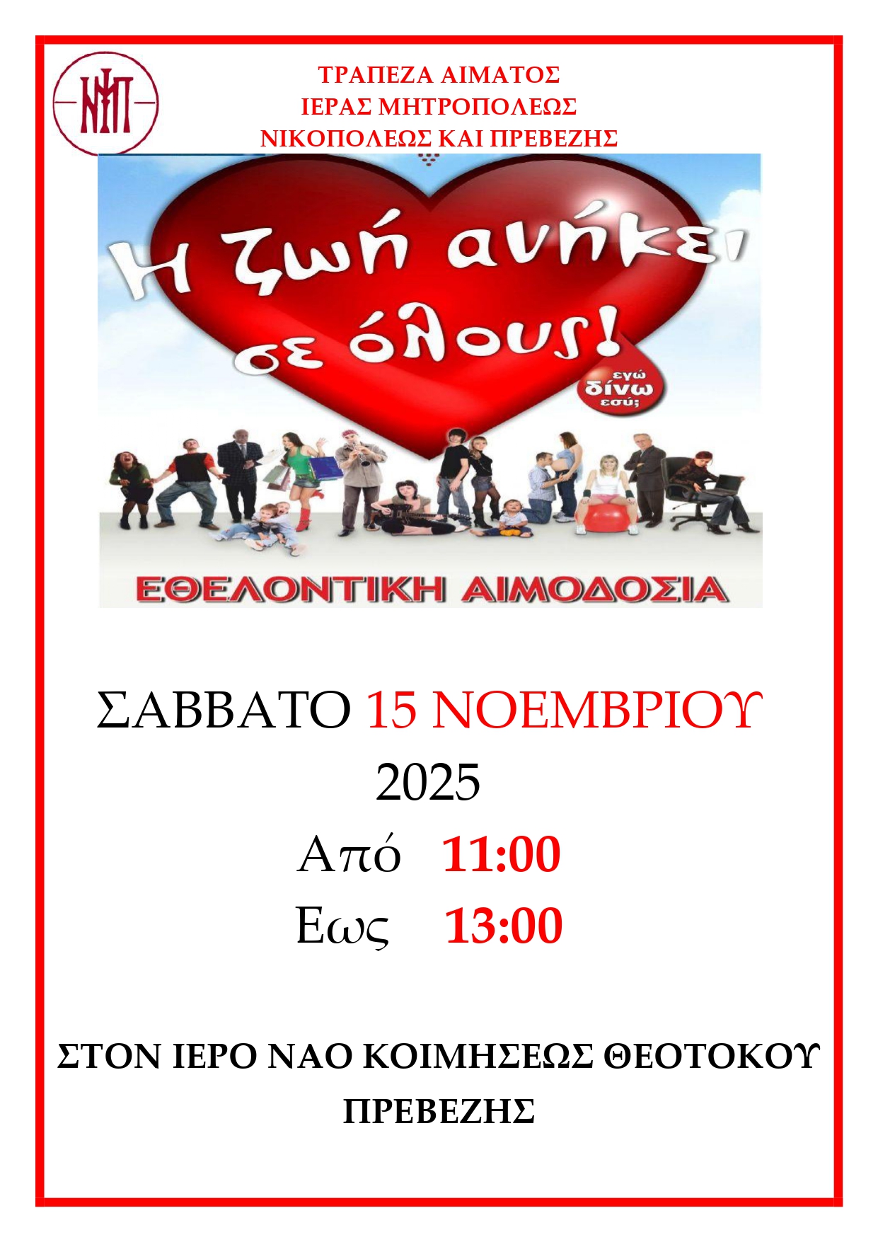 Κάνοντας πράξη την αγάπη προς τον συνάνθρωπο η Τράπεζα αίματος της Ιεράς Μητροπόλεως Νικοπόλεως και Πρεβέζης διοργανώνει εθελοντική αιμοδοσία το Σάββατο 15 Νοεμβρίου και τις ώρες 11:πμ έως 13:00μ.μ στον Ιερό Ναό Κοιμήσεως της Θεοτόκου.