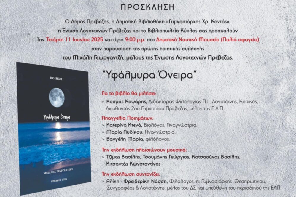 Η Ένωση Λογοτεχνών Πρέβεζας (Λογοτεχνική Στέγη) προσκαλεί τα μέλη της, τους φίλους της και τους πολίτες της Πρέβεζας, να παρευρεθούν στην παρουσίαση της πρώτης ποιητικής συλλογής του μέλους της Μιχάλη Γεωργαντζή, με τίτλο «Υφάλμυρα Όνειρα», που θα γίνει στο Δημοτικό Ναυτικό Μουσείο (Παλιά σφαγεία) στην Πρέβεζας την Τετάρτη 11 Ιουνίου 2025 και ώρα 9:00 μ.μ. Για το βιβλίο θα μιλήσει ο Κοσμάς Κοψάρης, Διδάκτορας Φιλολογίας Π.Ι., λογοτέχνης, κριτικός, Διευθυντής του 2ου γυμνασίου Πρέβεζας και μέλος της Ε.Λ.Π. Απαγγελίες ποιημάτων θα γίνουν από την Κατερίνα Κτενά (Βιολόγο, αναγνώστρια), τη Μαρία Αυδίκου (αναγνώστρια), και τη φιλόλογο Μαρία Βαγγέλη. Η εκδήλωση θα πλαισιωθεί μουσικά από τον Βασίλη Τζίμα, τον Γιώργο Τσουμάνη, τον Βασίλη Κατσαούνο και τον Κωνσταντίνο Κιτσαντά. Την εκδήλωση θα συντονίσει η Αλίκη-Φρειδερίκη Νάσση, Φιλόλογος, π. Γυμνασιάρχης Θεσπρωτικού, συγγραφέας και λογοτέχνης, μέλος του Δ.Σ. και υπεύθυνη του περιοδικού της Ε.Λ.Π. Την εκδήλωση συνδιοργανώνουν ο Δήμος Πρέβεζας, η Δημοτική Βιβλιοθήκη «Γυμνασιάρχης Χρ. Κοντός», η Ένωση Λογοτεχνών Πρέβεζας και το βιβλιοπωλείο Κύκλος.