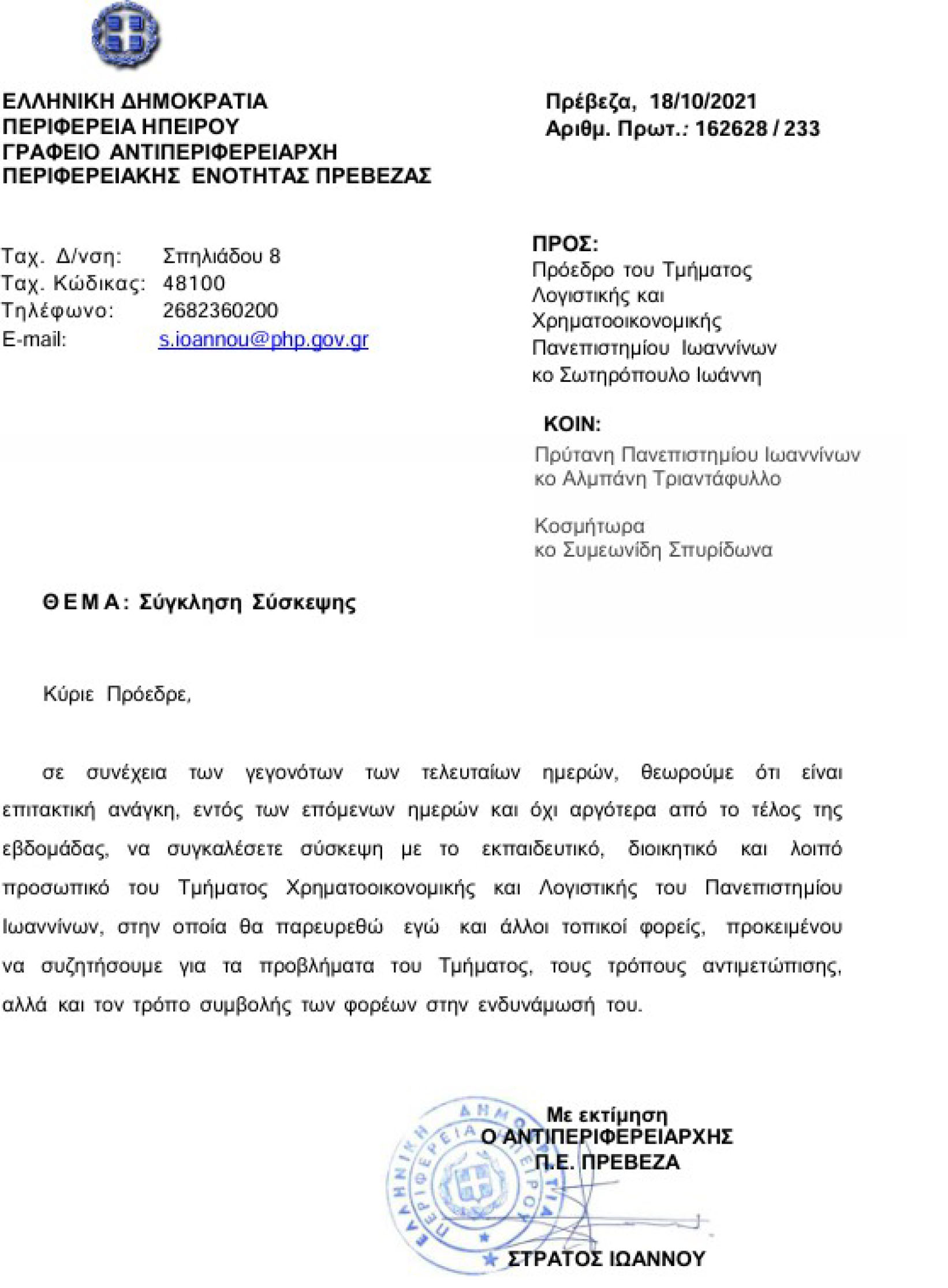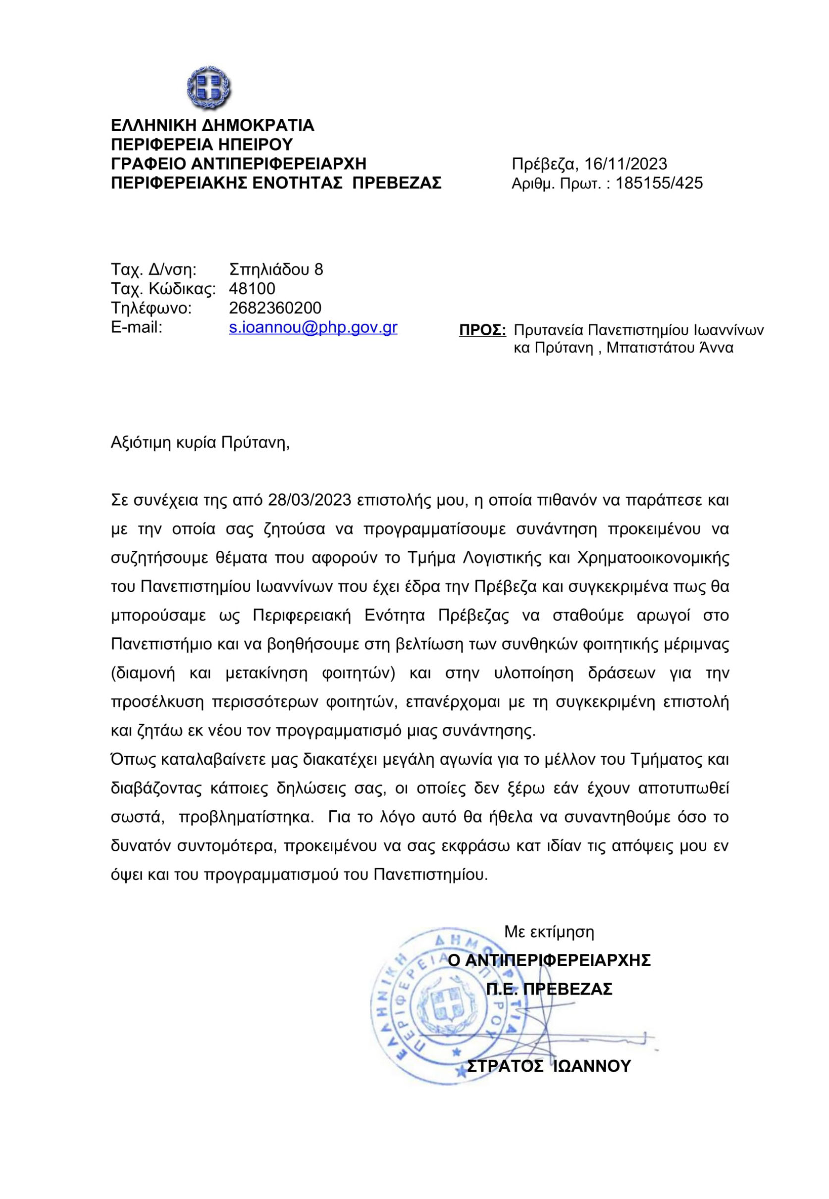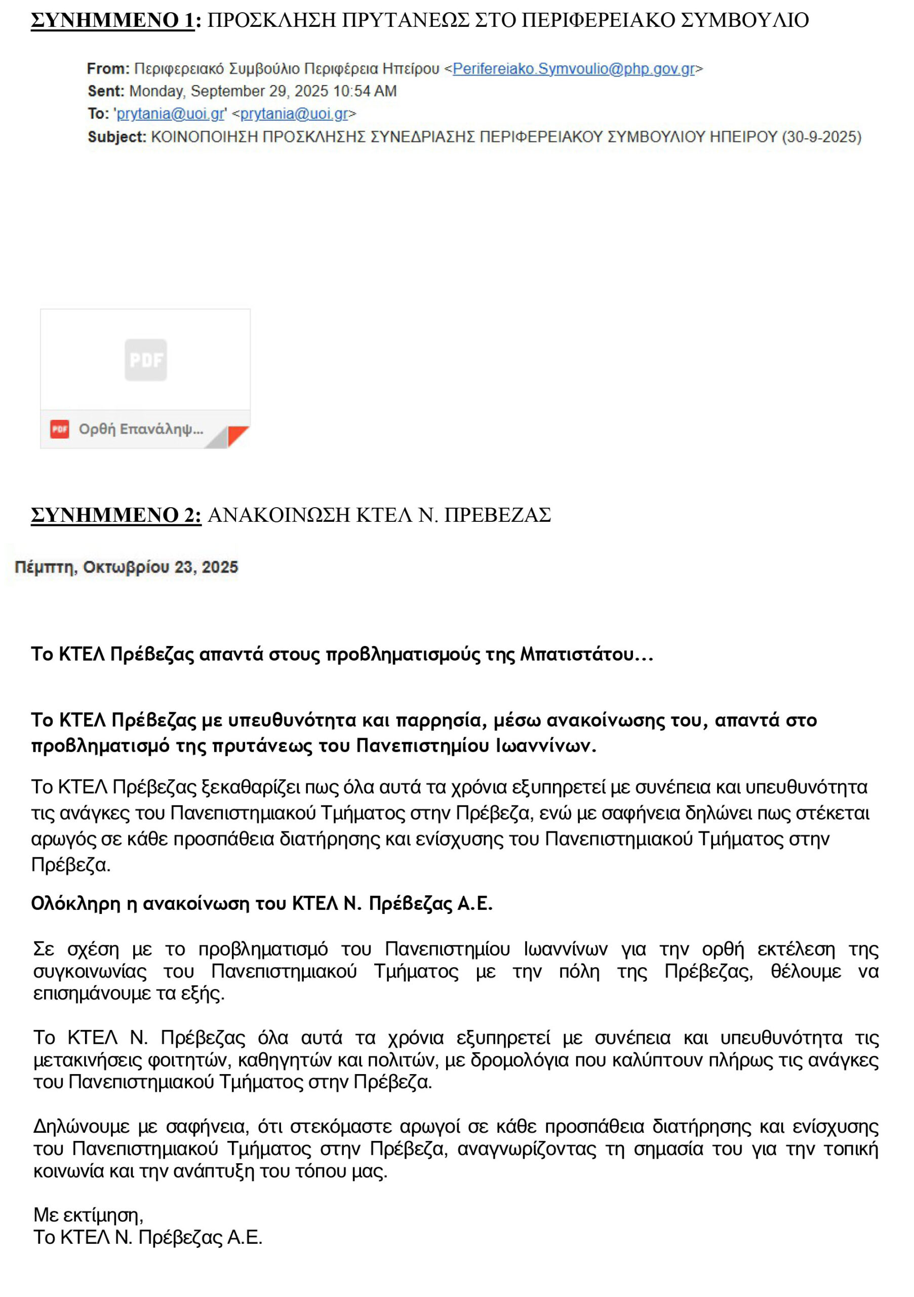 Διαβάζοντας τη συνέντευξη της Πρυτάνεως του Πανεπιστημίου Ιωαννίνων, κ. Άννας Μπατιστάτου, που αναπαράχθηκε από τον τοπικό και ηπειρωτικό Τύπο, θα ήθελα, προς ενημέρωση των αναγνωστών σας και προς αποκατάσταση της αλήθειας να διευκρινίσω, χωρίς να επεκταθώ, ορισμένα σημεία που διατυπώθηκαν δημόσια σχετικά με το Τμήμα Λογιστικής και Χρηματοοικονομικής της Πρέβεζας και τον ρόλο της Περιφέρειας Ηπείρου.
