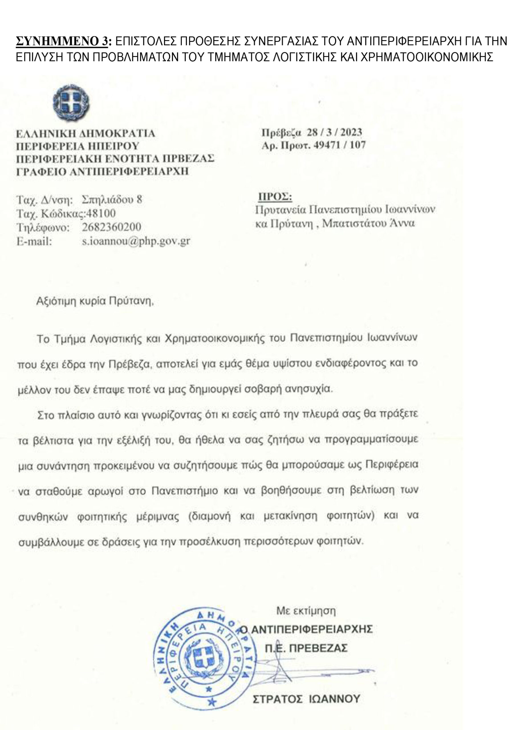 Πέμπτο, το Τμήμα Λογιστικής και Χρηματοοικονομικής της Πρέβεζας έχει αποδείξει το επιστημονικό και εκπαιδευτικό του κύρος. Διαθέτει ενεργό ερευνητικό έργο, διεθνείς συνεργασίες και αποφοίτους που διακρίνονται στον δημόσιο και ιδιωτικό τομέα. Το Πανεπιστήμιο Ιωαννίνων δεν ενισχύεται με τη συρρίκνωση ή τη μεταφορά ενός επιτυχημένου τμήματος, αλλά με τη στήριξη όλων των δομών του που αποδεικνύουν βιωσιμότητα και προοπτική.