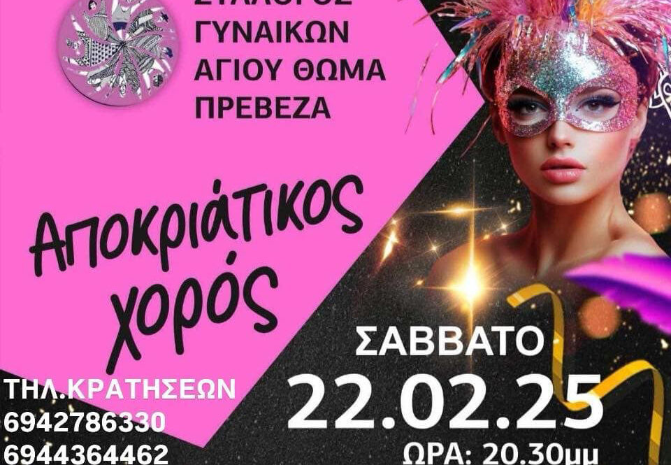 Ο Σύλλογος Γυναικών Αγ. Θωμά Πρέβεζας σας προσκαλεί στον ετήσιο αποκριάτικο χορό το Σάββατο 22 Φεβρουαρίου 2025 στο « ΑΤΡΙΟ» στις 20: 30 μ.μ