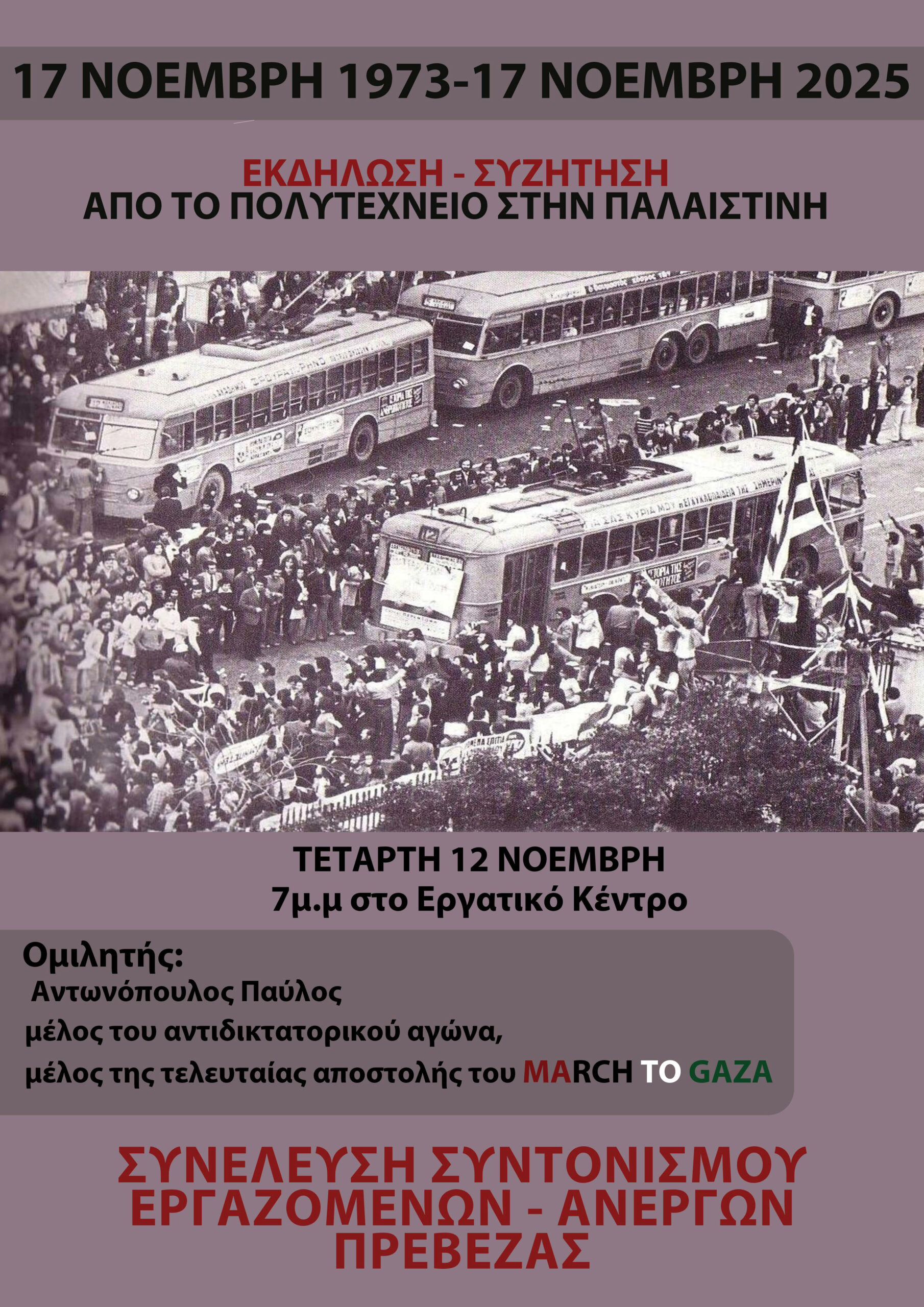 Από το Πολυτεχνείο στην Παλαιστίνη – Εκδήλωση της συνέλευσης συντονισμού εργαζομένων-ανέργων Πρέβεζας