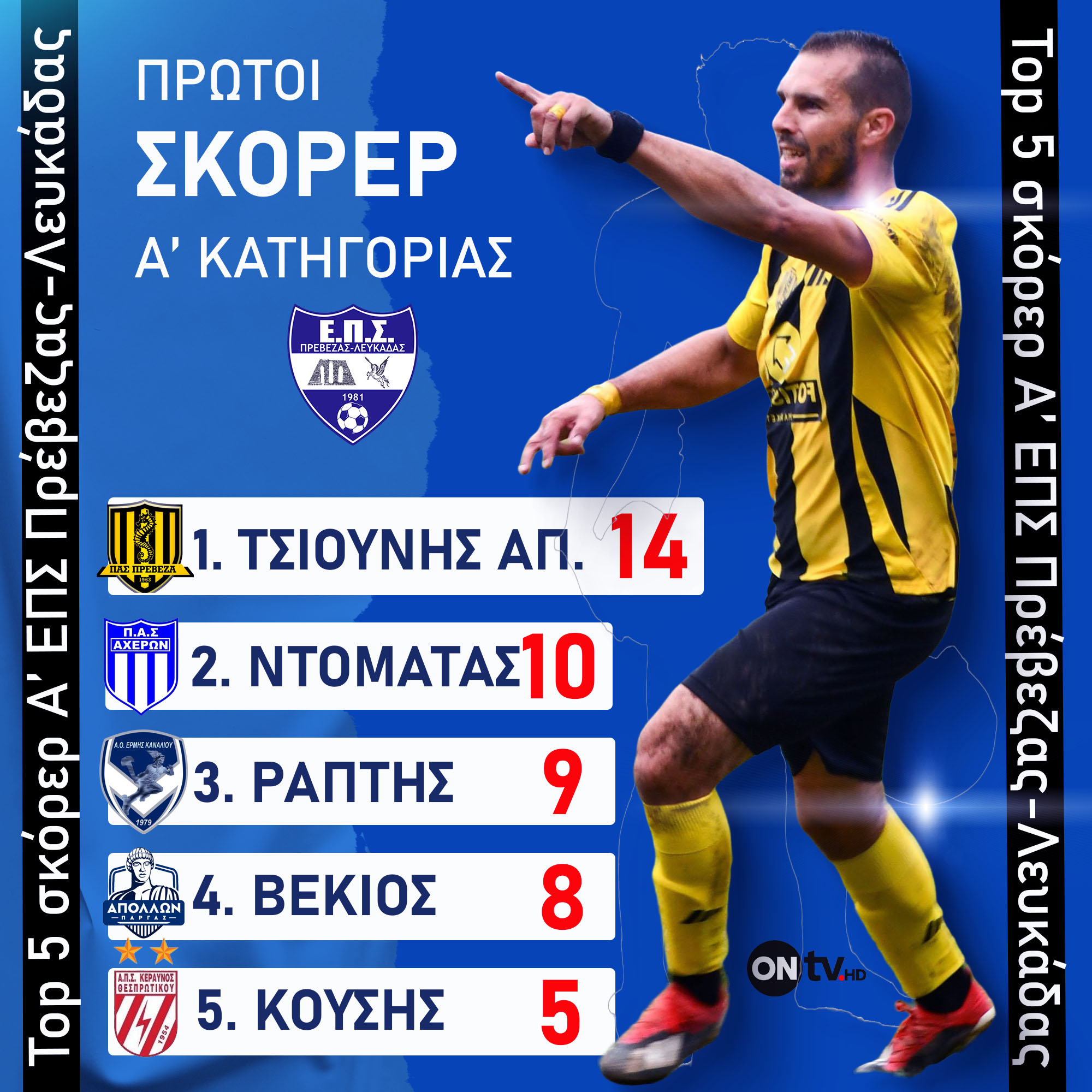 Με την επιθετική του συνέπεια, την εκτελεστική δεινότητα και την ικανότητά του να “διαβάζει” τις φάσεις μέσα στην περιοχή, ο Τσιούνης έχει δημιουργήσει πλέον μια διαφορά ασφαλείας από τους διώκτες του στον πίνακα των σκόρερ, αφήνοντας πίσω του τον Γιώργο Ντοματά του Αχέροντα Καναλακίου, ο οποίος ακολουθεί με 10 γκολ.