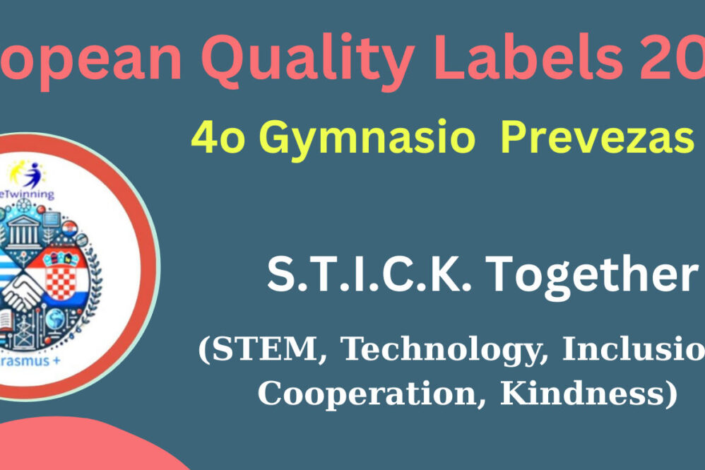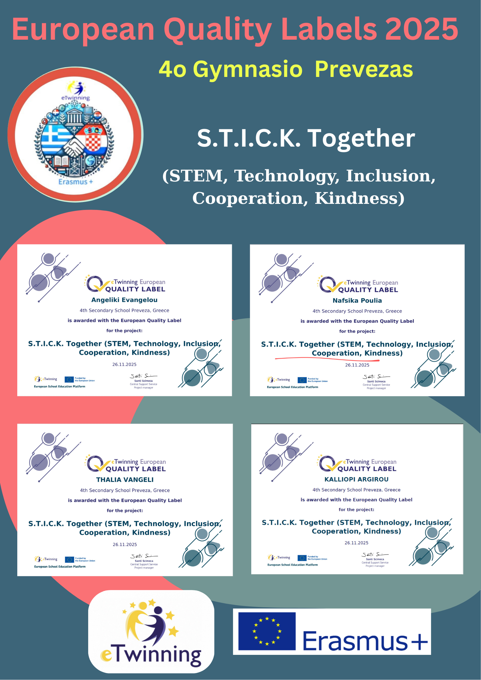 Για άλλη μια χρονιά επιβραβεύονται οι προσπάθειες εκπαιδευτικών και μαθητών σε Ευρωπαϊκό Επίπεδο. Στο πλαίσιο της Διαπίστευσης Erasmus+ (ΚΑ121) 2024-2027 που διαθέτει το 4ο Γυμνάσιο Πρέβεζας, Ευρωπαϊκές Ετικέτες ποιότητας eTwinning απονεμήθηκαν στην παιδαγωγική ομάδα του σχολείου μας (τέσσερις εκπαιδευτικοί και εικοσιτρείς μαθητές/τριες) που συμμετείχαν στην πραγματοποίηση δραστηριοτήτων του Ευρωπαϊκού προγράμματος Erasmus+/e-Twinning με τίτλο “S.T.I.C.K. Together”. Το 4ο Γυμνάσιο Πρέβεζας ήταν ο συνιδρυτής του προγράμματος με συντονιστικό σχολείο το Κροατικό σχολείο Osnovna skola Sesvetski Kraljevec, που εδρεύει στο Ζάγκρεμπ.
