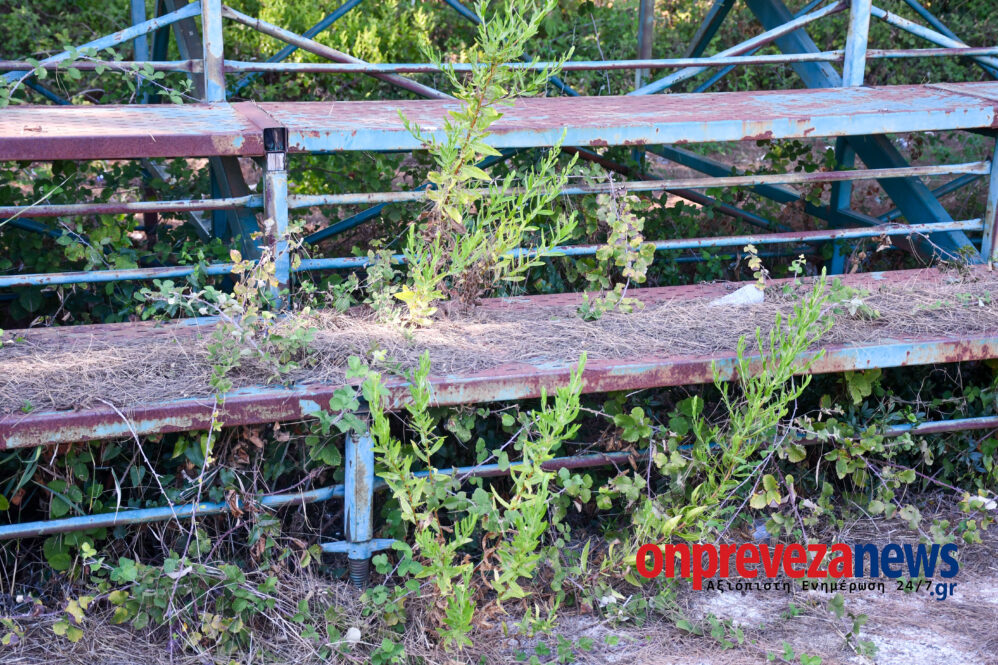Η κατάσταση στις κερκίδες είναι εξίσου επικίνδυνη: σιδερένιες κατασκευές που έχουν σκουριάσει, έχουν υποστεί σοβαρές ζημιές και πρέπει να αντικατασταθούν άμεσα. Οι θεατές κάθε φορά που κάθονται το κάνουν με τον κίνδυνο να βρεθούν στο κενό. Και σαν να μην έφτανε αυτό, τα χορτάρια έχουν «αγκαλιάσει» τις κερκίδες και τους περιβάλλοντες χώρους, δίνοντας εικόνα πλήρους εγκατάλειψης.