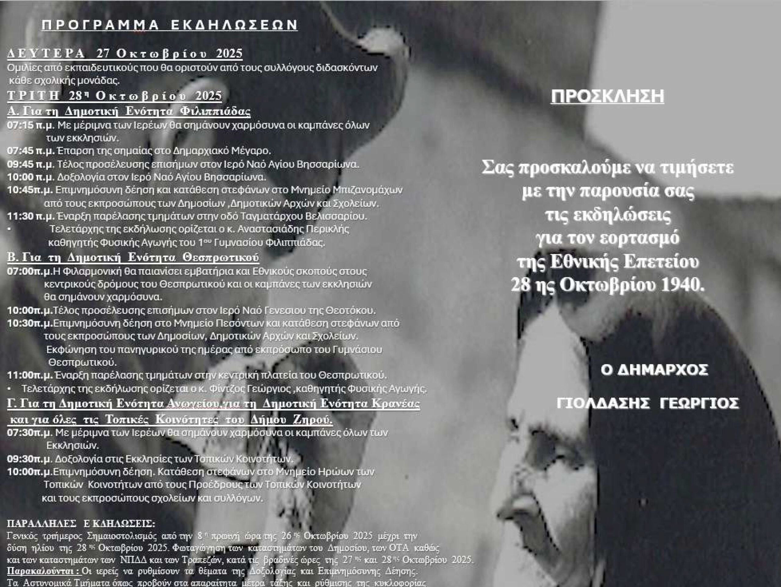 Ο Δήμος Ζηρού σας προσκαλεί να τιμήσετε με την παρουσία σας τις εκδηλώσεις για τον εορτασμό της Εθνικής Επετείου της 28ης Οκτωβρίου 1940. Με σεβασμό και υπερηφάνεια, τιμούμε το ιστορικό “ΟΧΙ” και τους αγώνες του ελληνικού λαού για ελευθερία και εθνική ανεξαρτησία.