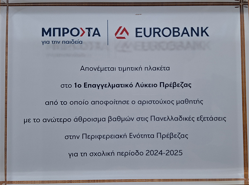 Τα βραβεία για τους αριστούχους μαθητές/τριες και η τιμητική πλακέτα απονεμήθηκαν από τη Eurobank στο πλαίσιο της πρωτοβουλίας “Μπροστά για την Παιδεία”. Την πλακέτα παρέλαβε ο διευθυντής του σχολείου κ. Καγκελάρης Νικόλαος.
