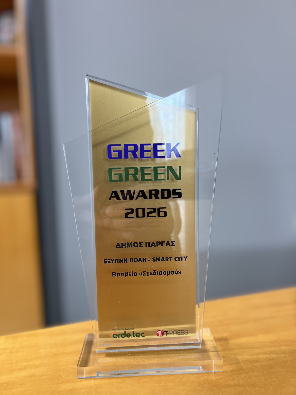 Σημαντική διάκριση απέσπασε ο Δήμος Πάργας στο πλαίσιο της 8ης Διεθνούς Έκθεσης Τεχνολογιών Περιβάλλοντος VERDE.TEC, καθώς βραβεύτηκε στα Greek Green Awards στην κατηγορία «Έξυπνη Πόλη – Smart City», λαμβάνοντας το βραβείο σχεδιασμού για τις δράσεις και τις παρεμβάσεις που υλοποιεί με στόχο τη βιώσιμη ανάπτυξη και τον εκσυγχρονισμό των δημοτικών υποδομών.