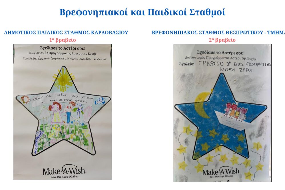 Ο Δήμος Ζηρού με ιδιαίτερη χαρά ανακοινώνει τη σημαντική διάκριση του 2ου Βρεφονηπιακού Σταθμού Θεσπρωτικού στον πανελλήνιο δημιουργικό διαγωνισμό «Σχεδίασε το Αστέρι σου», που διοργάνωσε ο “Make – A – Wish”  Ελλάδας.