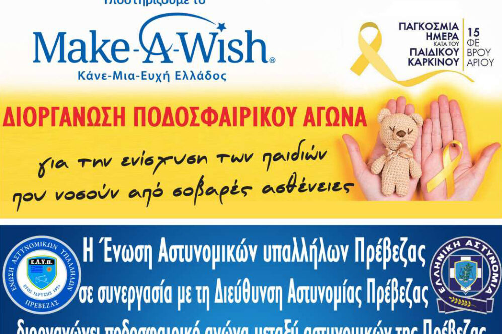 Με αφορμή την παγκόσμια ημέρα κατά του παιδικού καρκίνου, η Ένωση Αστυνομικών Υπαλλήλων Πρέβεζας σε συνεργασία με τη Διεύθυνση Αστυνομίας Πρέβεζας, διοργανώνει στη Πρέβεζα, την 25 Φεβρουαρίου 2025, αγώνα ποδοσφαίρου μεταξύ αστυνομικών με σκοπό την στήριξη του οργανισμού Make a wish και κατ’ επέκταση τη στήριξη παιδιών με σοβαρές ασθένειες.