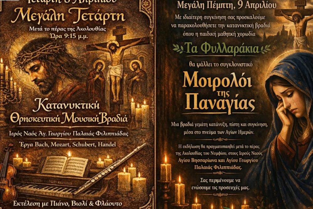 Δύο ξεχωριστές εκδηλώσεις θρησκευτικού και πολιτιστικού χαρακτήρα θα λάβουν χώρα στην Παλαιά Φιλιππιάδα, εν όψει της Μεγάλης Εβδομάδας.