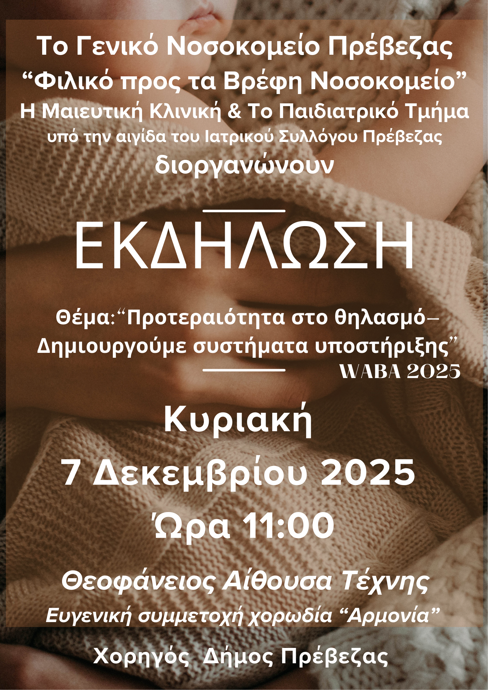Η εκδήλωση, με θέμα «Προτεραιότητα στον θηλασμό – Δημιουργούμε συστήματα υποστήριξης» (WABA 2025), θα πραγματοποιηθεί την Κυριακή 7 Δεκεμβρίου 2025 και ώρα 11:00, στη Θεοφάνειο Αίθουσα Τέχνης.