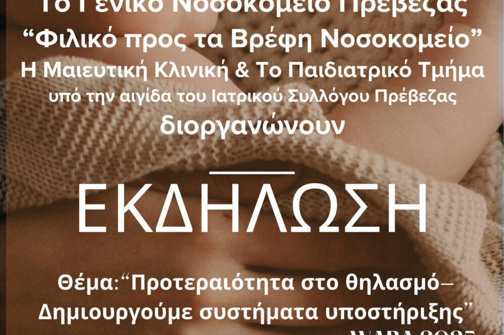 Το Γενικό Νοσοκομείο Πρέβεζας, πιστοποιημένο ως “Φιλικό προς τα Βρέφη Νοσοκομείο”, σε συνεργασία με τη Μαιευτική Κλινική και το Παιδιατρικό Τμήμα και υπό την αιγίδα του Ιατρικού Συλλόγου Πρέβεζας, διοργανώνει ειδική εκδήλωση αφιερωμένη στον θηλασμό.