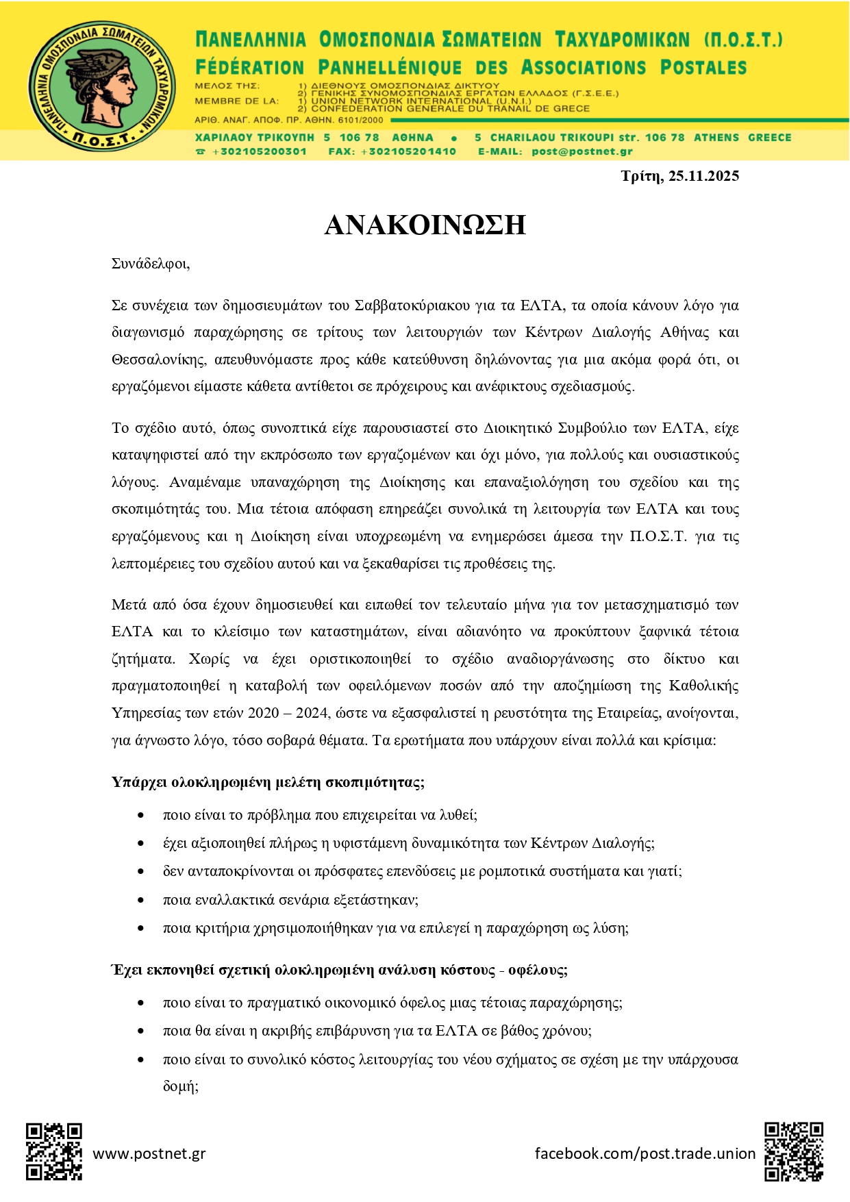 Ελλάδα Τρίτη 25 Νοεμβρίου 2025 - 15:53 ΕΛΤΑ: Ανακοίνωση Π.Ο.Σ.Τ. για τα σχέδια παραχώρησης των Κέντρων Διαλογής από ΟΜΑΔΑ ΣΥΝΤΑΞΗΣ ελτα ΕλλάδαΕΛΤΑ