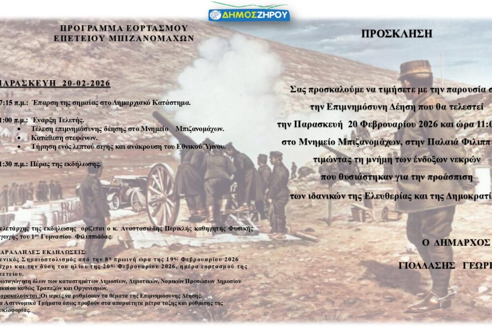 Σας προσκαλούμε να τιμήσετε με την παρουσία σας τον Εορτασμό της Επετείου των Μπιζανομάχων, που θα πραγματοποιηθεί την Παρασκευή 20 Φεβρουαρίου 2026 και ώρα 11:00 π.μ., στο Μνημείο Μπιζανομάχων, στην Παλαιά Φιλιππιάδα.