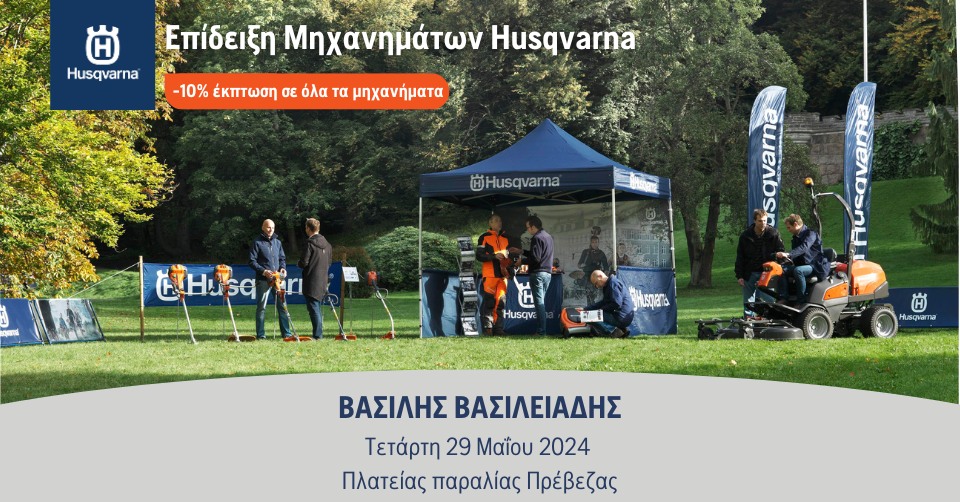 Η Husqvarna® και το επιλεγμένο κατάστημα ΒΑΣΙΛΗΣ ΒΑΣΙΛΕΙΑΔΗΣ οργανώνουν την Τετάρτη 29 Μαΐου επίδειξη μηχανημάτων της Husqvarna® στην πλατεία της παραλίας στην Πρέβεζα.