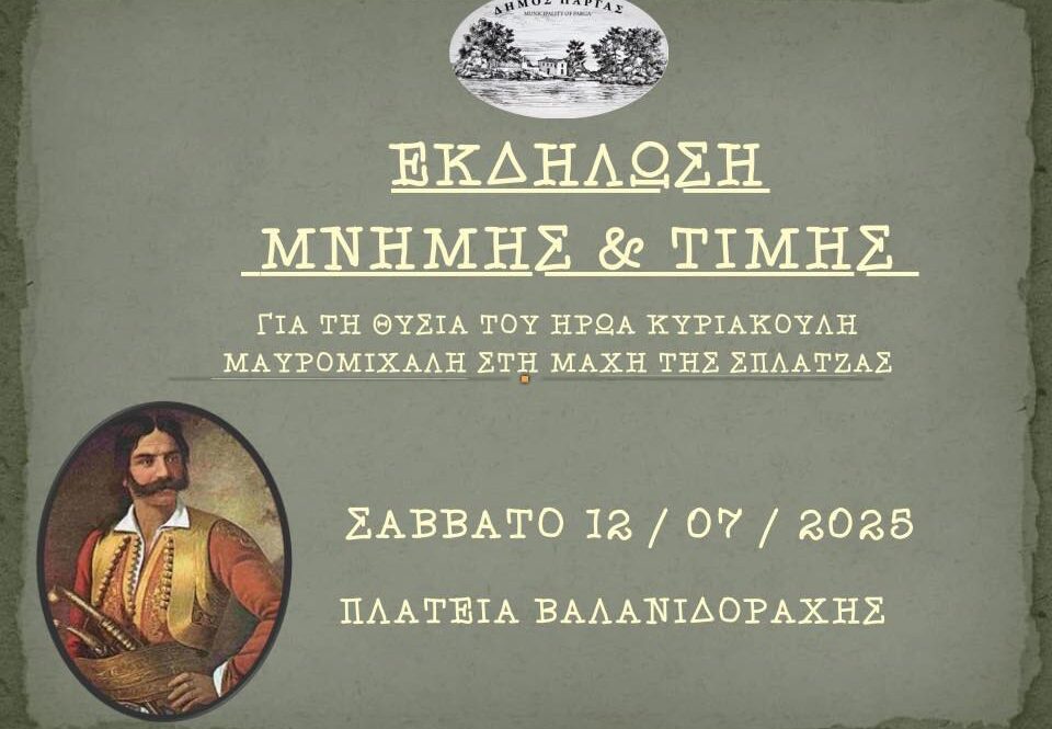 Ο Δήμος Πάργας διοργανώνει και φέτος, με την αρμόζουσα επισημότητα και σεβασμό στην ιστορική μνήμη, την ετήσια επετειακή εκδήλωση για τη Μάχη της Σπλάτζας. Η εκδήλωση θα πραγματοποιηθεί το Σάββατο 12 Ιουλίου 2025 και ώρα 20:00 μ.μ. στην Πλατεία της Βαλανιδορράχης.