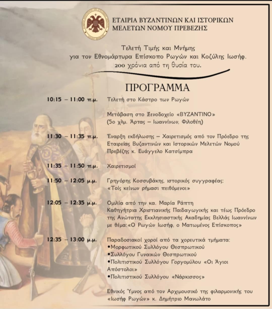 Η Εταιρεία Βυζαντινών και Ιστορικών Μελετών Νομού Πρεβέζης, στο πλαίσιο της μακρόχρονης της αποστολής για τη διαφύλαξη και ανάδειξη της ιστορικής μνήμης και της πνευματικής κληρονομιάς του τόπου, διοργανώνει την Κυριακή 29 Μαρτίου 2026 Τελετή Τιμής και Μνήμης προς τιμήν του Επισκόπου Ρωγών και Κοζύλης Ιωσήφ, με αφορμή τη συμπλήρωση διακοσίων (200) ετών από τον μαρτυρικό του θάνατο.