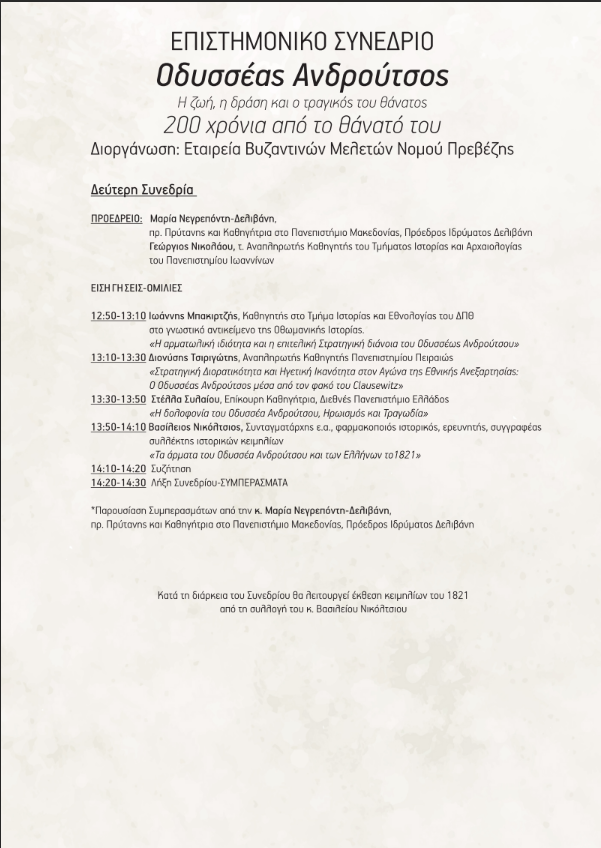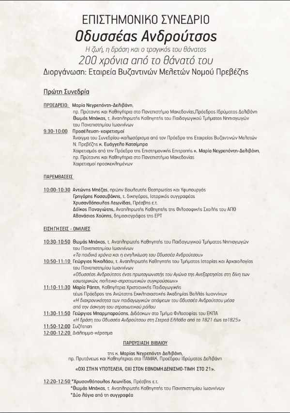 Η πραγματοποίηση του Συνεδρίου που διοργανώνουμε για το Σάββατο 27 Σεπτεμβρίου στην Πρέβεζα, με θέμα τον Οδυσσέα Ανδρούτσο, πλησιάζει σε λίγες μέρες.