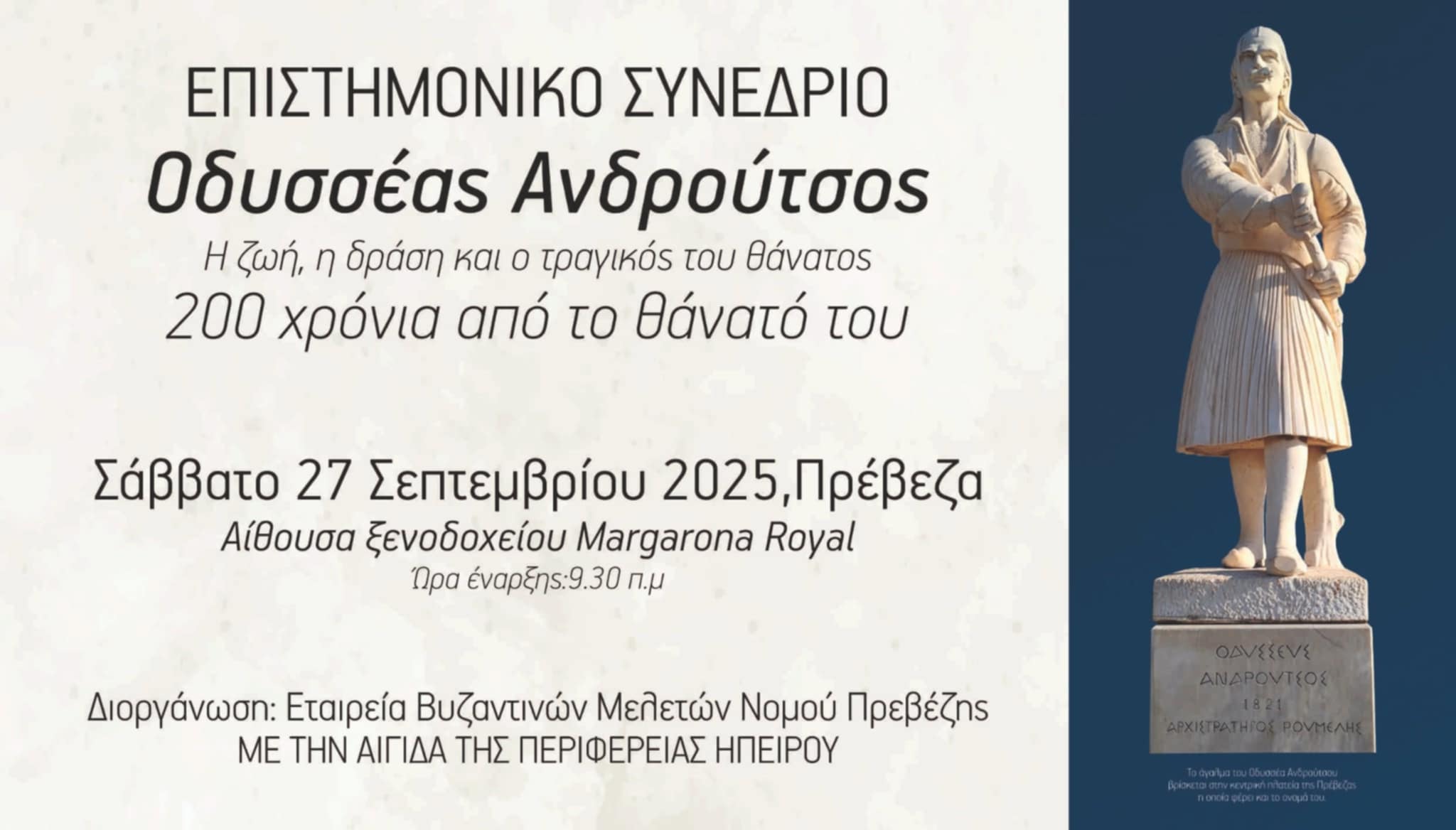 Το Σάββατο 27 Σεπτεμβρίου 2025 θα πραγματοποιηθεί το Επιστημονικό Συνέδριο που διοργανώνει η Εταιρεία μας για τον Οδυσσέα Ανδρούτσο, γέννημα της Πρέβεζας, με θέμα: «Η ζωή, η δράση και ο τραγικός του θάνατος», με την ευκαιρία της συμπλήρωσης 200 ετών από την δολοφονία του.
