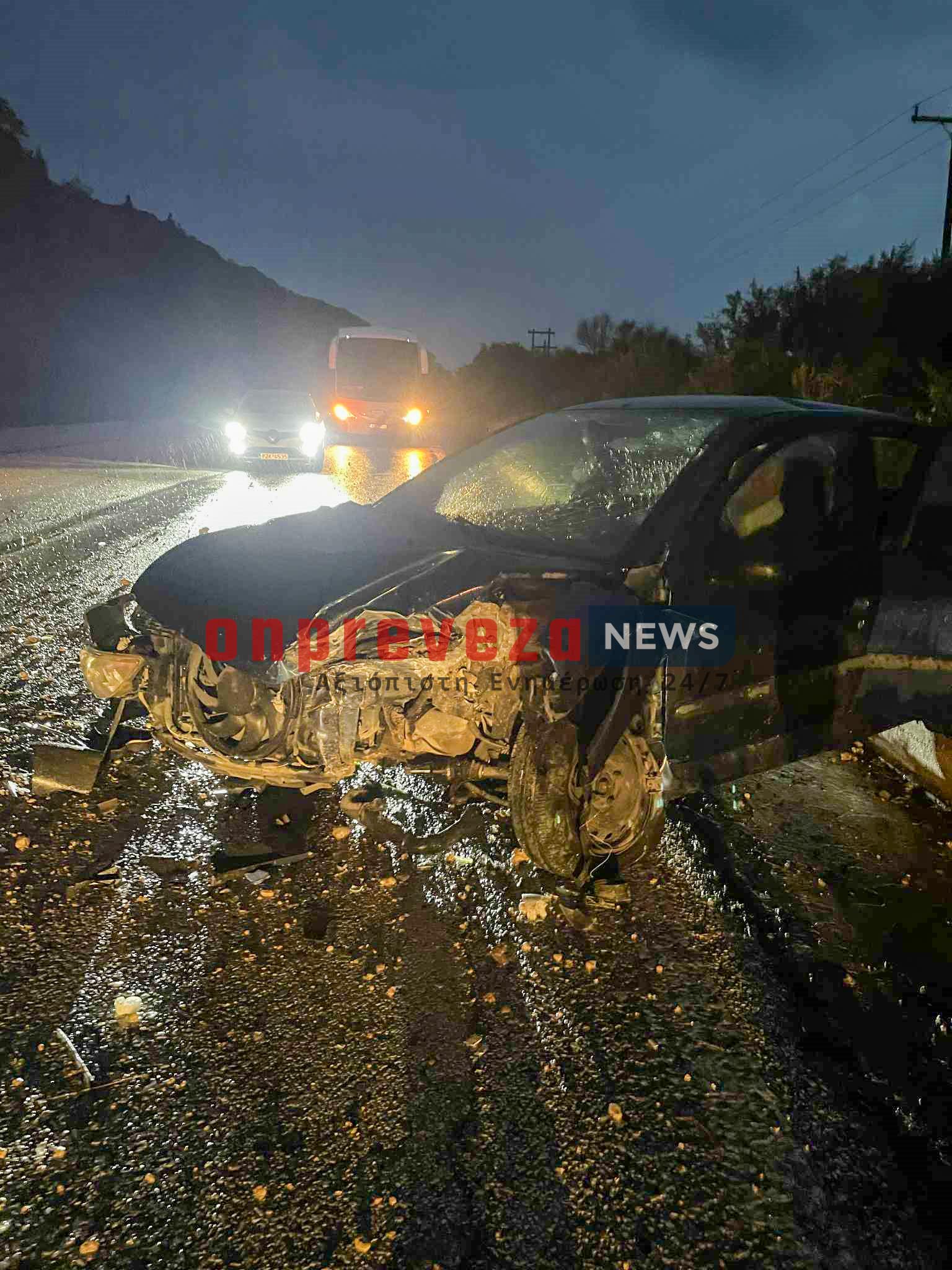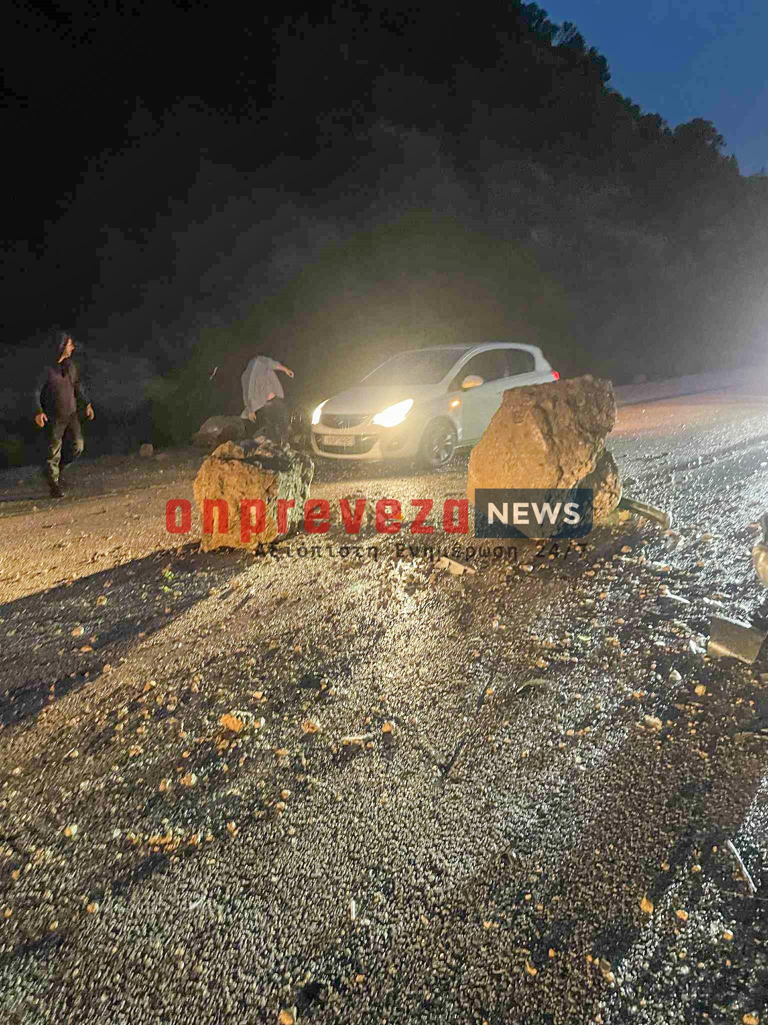 Σύμφωνα με τις πρώτες πληροφορίες, ο οδηγός ενός Ι.Χ. αυτοκινήτου, που κινούνταν πιθανότατα προς Πρέβεζα, δεν πρόλαβε να αντιδράσει όταν μεγάλοι βράχοι είχαν πέσει στο οδόστρωμα. Το όχημα προσέκρουσε πάνω τους, με αποτέλεσμα να ακινητοποιηθεί στη μέση του δρόμου. Ελάχιστα δευτερόλεπτα αργότερα, ένα ημιφορτηγάκι που ακολουθούσε την ίδια κατεύθυνση αντιλήφθηκε το ακινητοποιημένο Ι.Χ. την τελευταία στιγμή. Στην προσπάθειά του να το αποφύγει, ο οδηγός έκανε έναν απότομο ελιγμό, με αποτέλεσμα το όχημα να εκτραπεί της πορείας του και να καταλήξει σε παρακείμενη χαράδρα.