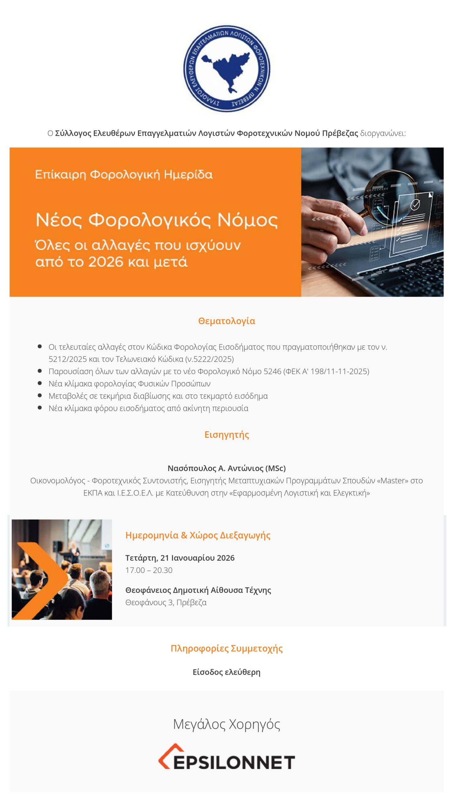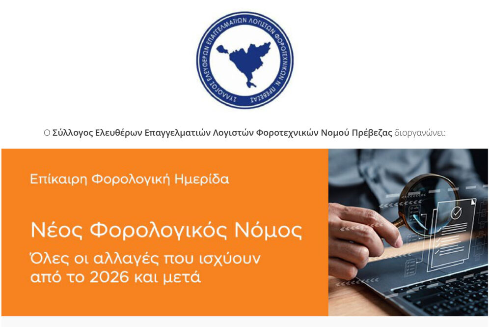 Ημερίδα με θέμα τον Νέο Φορολογικό Νόμο διοργανώνει ο Σ.Ε.Ε.Λ.ΦΟ. Νομού Πρέβεζας, σε συνεργασία με την εταιρεία EPSILONNET, την Τετάρτη 21 Ιανουαρίου 2026, στις 17:00, στη Θεοφάνειο Αίθουσα.
