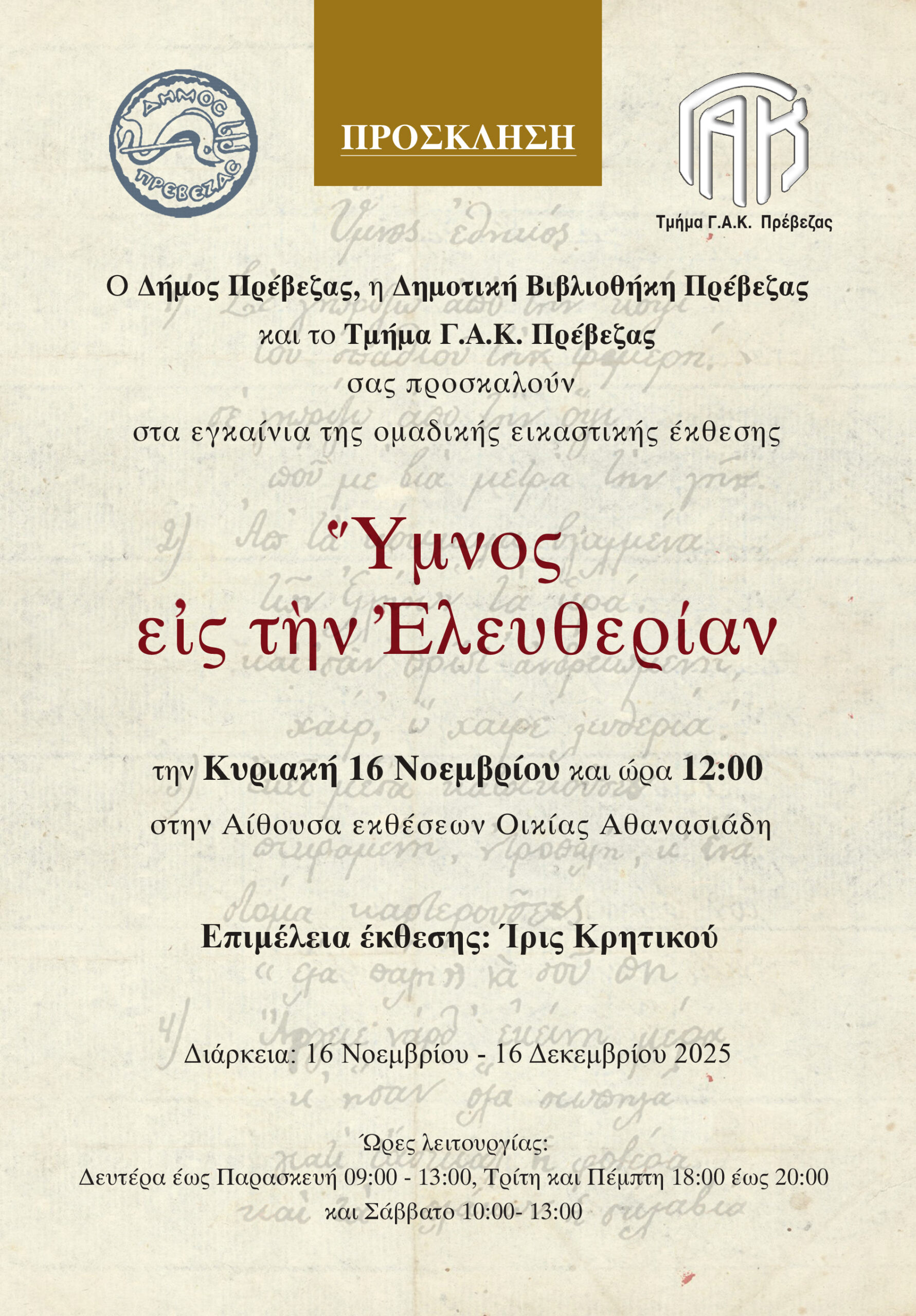 Την εικαστική έκθεση “Ύμνος εις την Ελευθερίαν” θα φιλοξενήσει το επόμενο διάστημα η Πρέβεζα.