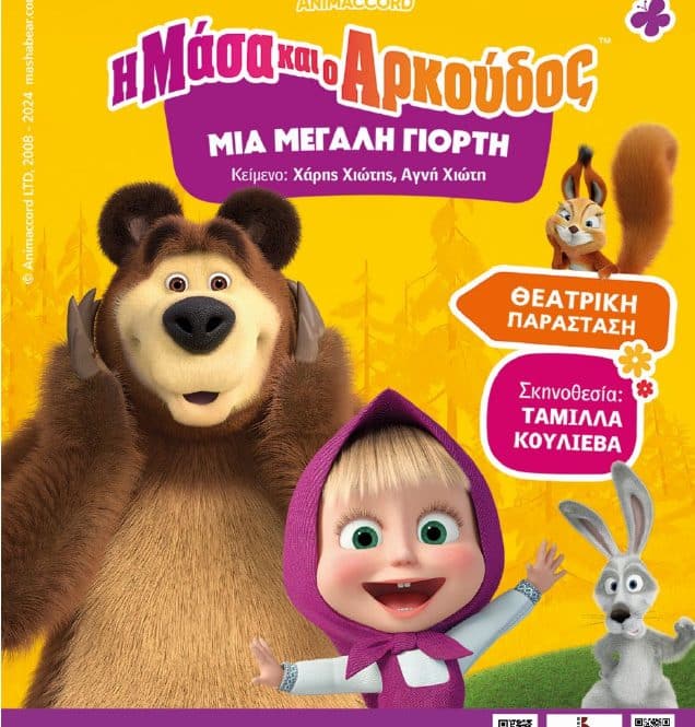 «Η Μάσα και ο Αρκούδος, μια μεγάλη γιορτή» η επίσημη θεατρική παράσταση, ζωντανεύει τον μαγικό κόσμο της παγκόσμιας επιτυχημένης σειράς κινουμένων σχεδίων. Με τα αυθεντικά κοστούμια του εξωτερικού.