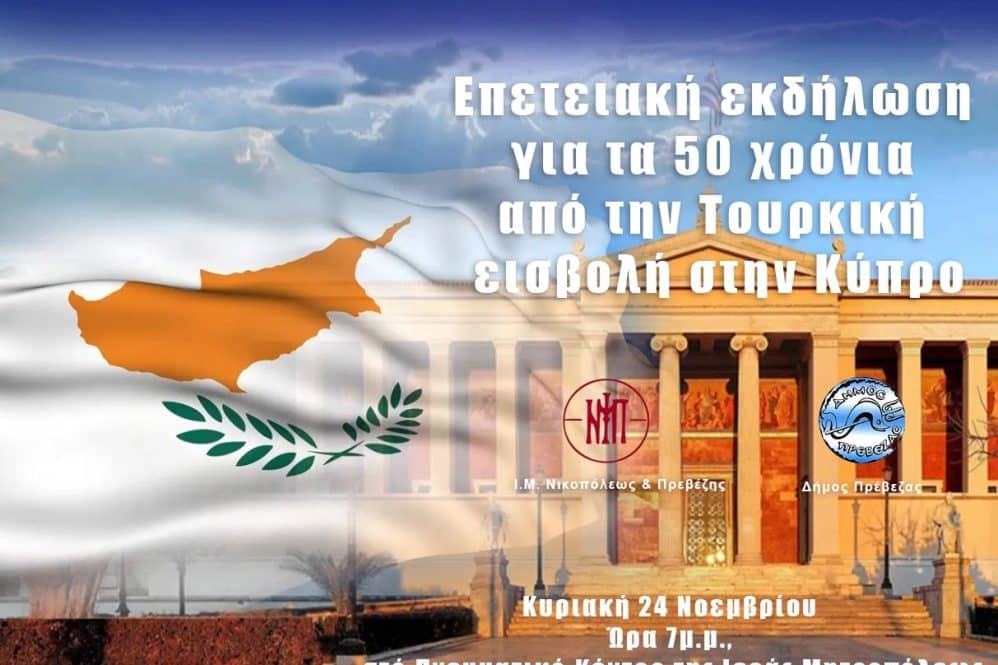 Τήν Κυριακή 24 Νοεμβρίου ὥρα 7μ.μ., στό Πνευματικό Κέντρο τῆς Ἱερᾶς Μητροπόλεως, θά πραγματοποιηθεῖ ἐκδήλωση τιμῆς καί μνήμης, ἐπί τῆ συμπληρώσει 50 χρόνων ἀπό τῆς τουρκικῆς εἰσβολῆς στήν Κύπρο.