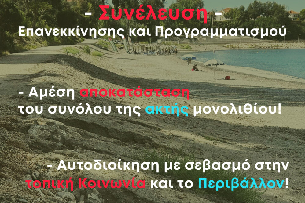 Δυστυχώς όμως τα υλικά λατομείου που ρίχτηκαν – χωρίς μελέτη- για την κατασκευή του νέου δρόμου και την αντιμετώπιση των κυμάτων του χειμώνα, παραμένουν ακόμη σήμερα στην ακτή. Για να μην μείνει το Μονολίθι χώρος στρωμένος με 3Α και ογκόλιθους είναι καιρός να δράσουμε ξανά όλοι/ες μαζί και να απαιτήσουμε το αυτονόητο: «το Μονολίθι να παραδοθεί στους/ις πολίτες/ισσες όπως ήταν πριν τις εργασίες για τον ποδηλατόδρομο».