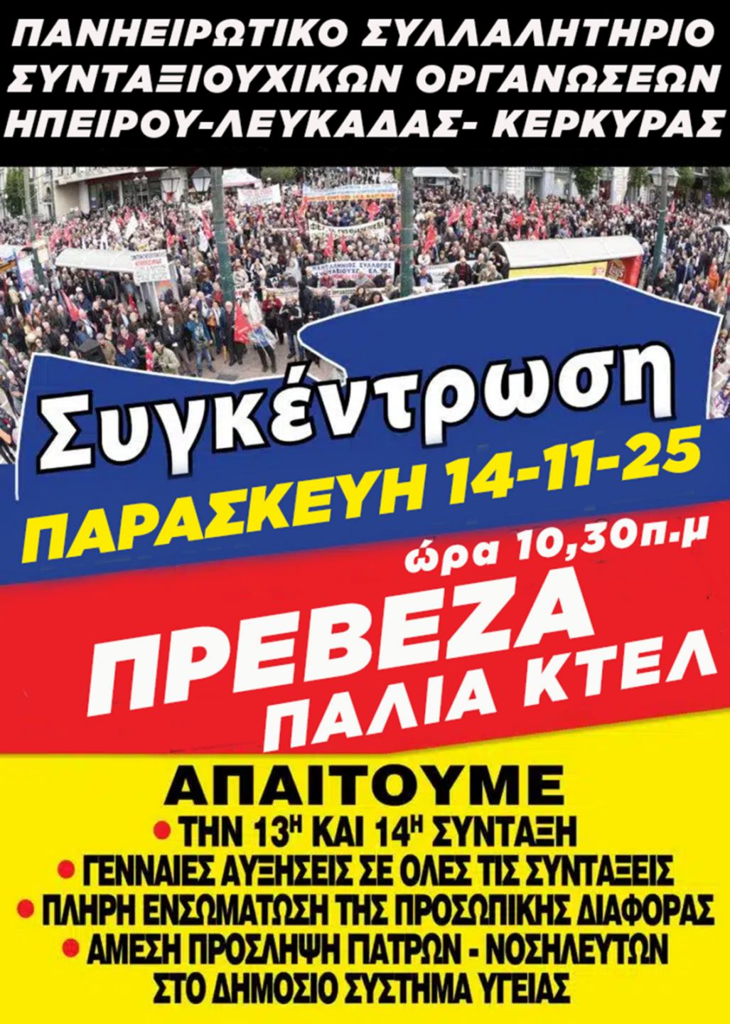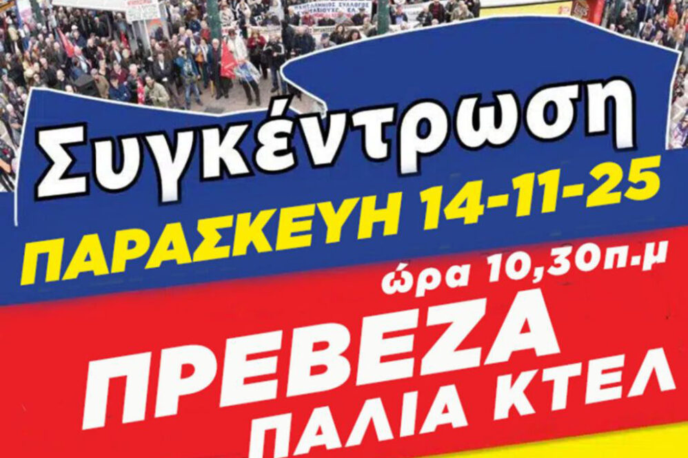 «Κάλεσμα των συνταξιούχων της Πρέβεζας στο Πανηπειρωτικό συλλαλητήριο στις 14 Νοέμβρη»