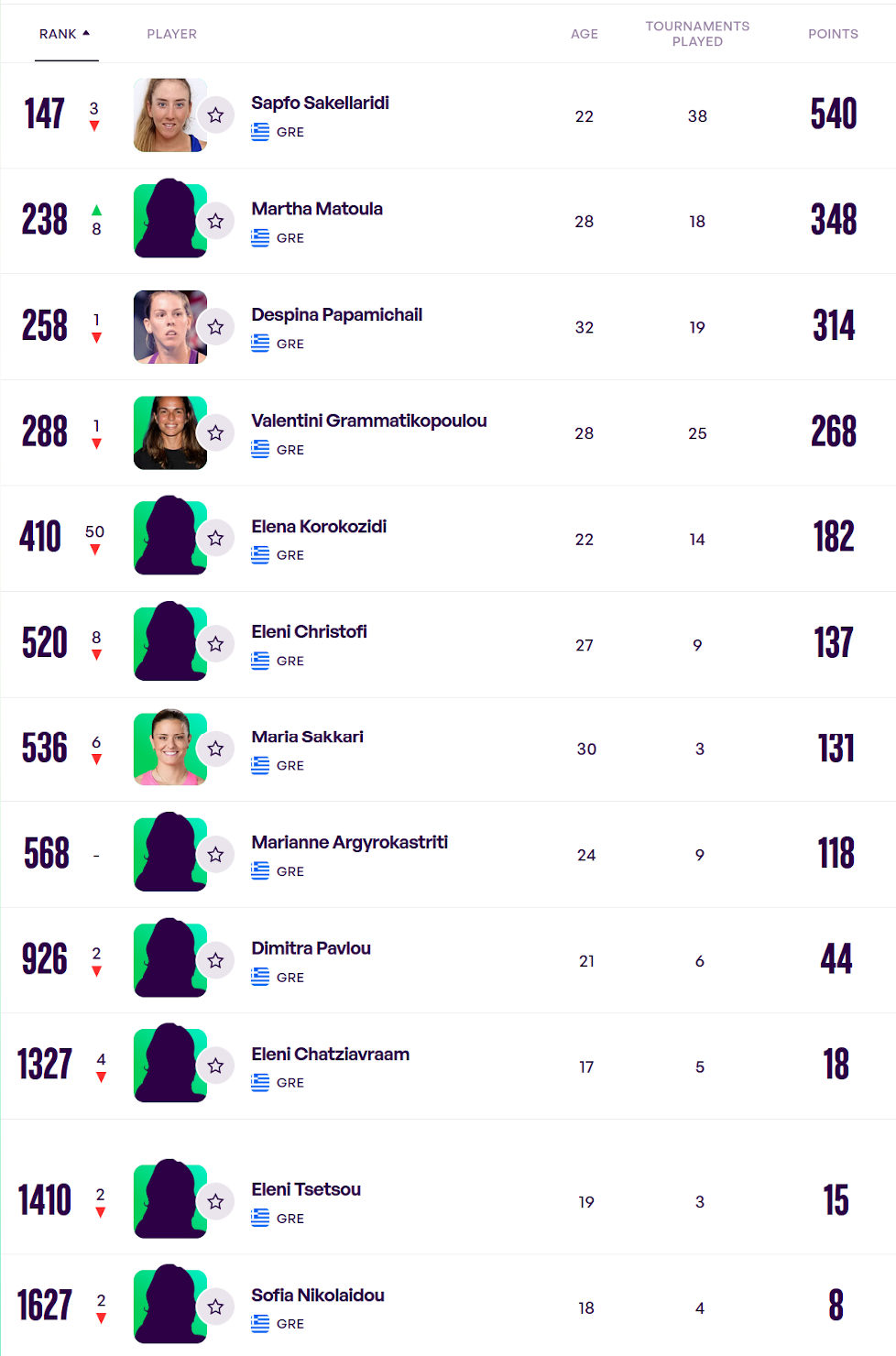 Η Δήμητρα Παύλου, που τους τελευταίους μήνες έχει μείνει εκτός με τραυματισμό, βρίσκεται στο Νο.714. Η Μαριάννα Αργυροκαστρίτη στο Νο.861, ενώ στο Νο.866 είναι η Έλενα Κοροκοζίδη, η οποία θα κερδίσει αρκετό έδαφος την επόμενη εβδομάδα, από τον 1ο τίτλο της σε Futures που κέρδισε χθες στο Ηράκλειο. Στην κατάταξη είναι και η Ελένα Τσέτσου, που έχει 3 βαθμούς WTA.