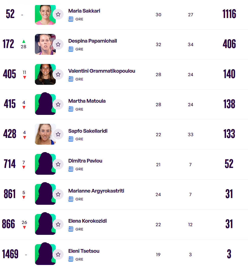 Πάντα κορυφαία Ελληνίδα τενίστρια είναι βεβαίως η Μαρία Σάκκαρη, η οποία έμεινε αμετακίνητη κι αυτή την εβδομάδα, στο Νο.52 του κόσμου.