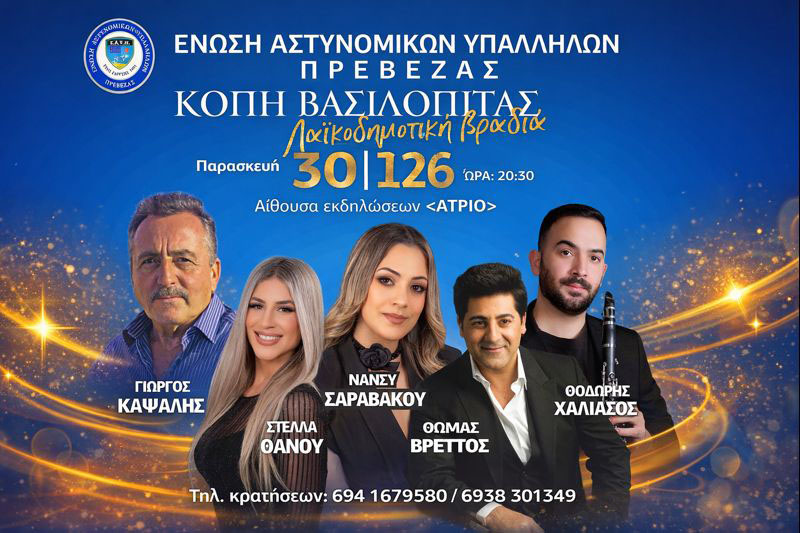 Η Ένωση Αστυνομικών Υπαλλήλων Πρέβεζας σας προσκαλεί να τιμήσετε με την παρουσία σας την ετήσια Κοπή της Βασιλόπιτας, η οποία θα πραγματοποιηθεί την Παρασκευή 30 Ιανουαρίου 2026 και ώρα 20:30, στην αίθουσα εκδηλώσεων «ΆΤΡΙΟ» στην Πρέβεζα.