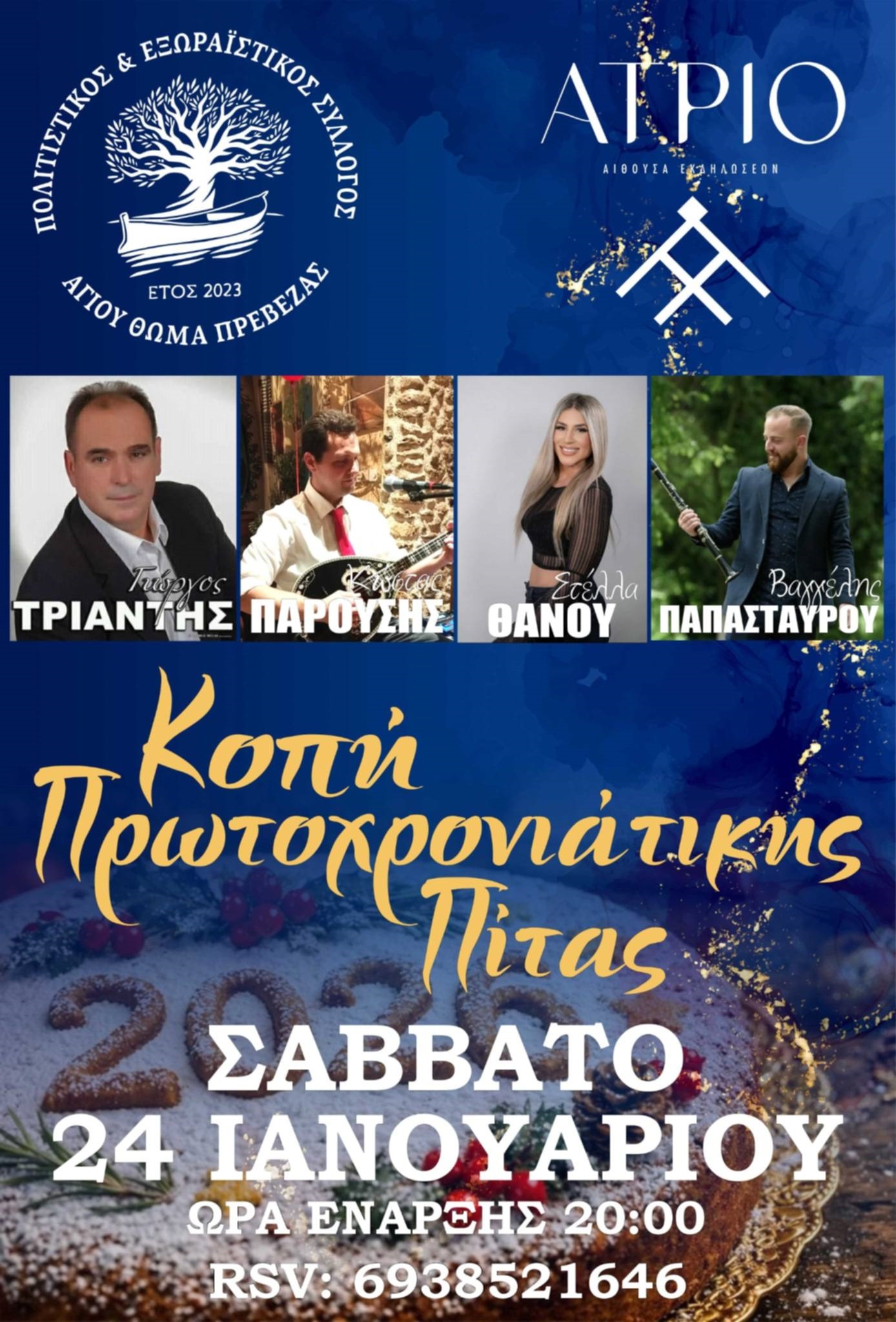 Την κοπή της Πρωτοχρονιάτικης πίτας του διοργανώνει ο Πολιτιστικός και Εξωραϊστικός Σύλλογος Αγίου Θωμά Πρέβεζας, το Σάββατο 24 Ιανουαρίου 2026, στις 20:00, στην αίθουσα εκδηλώσεων ATRIO.