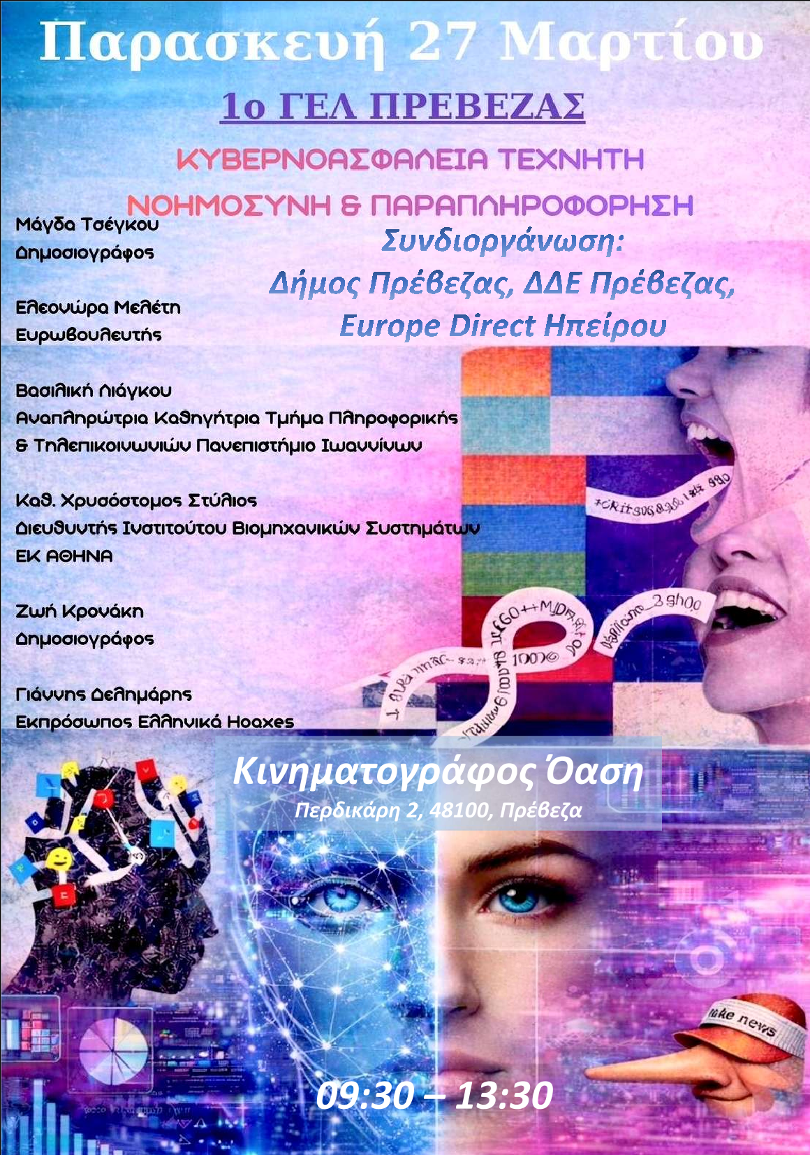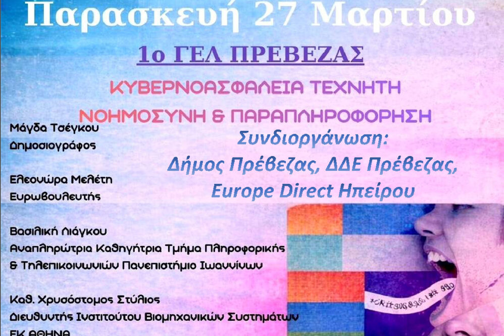 Με ιδιαίτερο επιστημονικό και κοινωνικό ενδιαφέρον πραγματοποιείται την Παρασκευή 27 Μαρτίου 09:30 – 13:30 στον Κινηματογράφο Όαση, Περδικάρη 2, Πρέβεζα η εκδήλωση του προγράμματος EPAS του 1ου Γενικού Λυκείου Πρέβεζας, με αντικείμενο τις σύγχρονες προκλήσεις της κυβερνοασφάλειας, της τεχνητής νοημοσύνης και της διαδικτυακής παραπληροφόρησης. Η εκδήλωση συνδιοργανώνεται με τον Δήμο Πρέβεζας, την Διεύθυνση Δευτεροβάθμιας Εκπαίδευσης Πρέβεζας και το Europe Direct Ηπείρου.