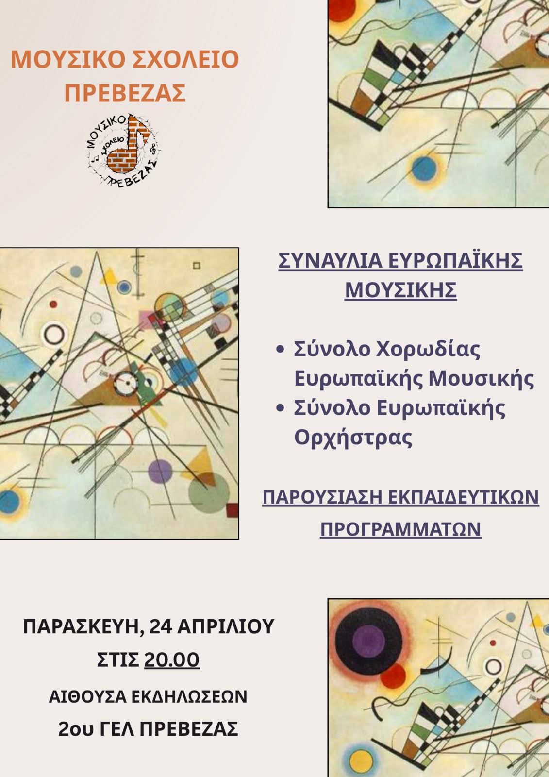 Μια ξεχωριστή μουσική βραδιά ετοιμάζει το Μουσικό Σχολείο Πρέβεζας, προσκαλώντας το κοινό σε μια υψηλού επιπέδου συναυλία Ευρωπαϊκής Μουσικής, την Παρασκευή 24 Απριλίου 2026, στις 20:00, στην αίθουσα εκδηλώσεων του 2ου ΓΕΛ Πρέβεζας.