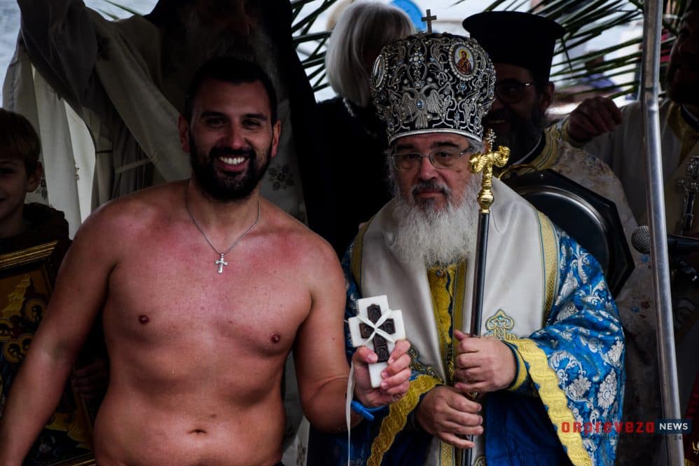 Από εκεί ο Σεβασμιώτατος Μητροπολίτης Νικοπόλεως και Πρεβέζης Χρυσόστομος μαζί με ιερείς ευρισκόμενοι σε σκάφος, πέταξαν τον σταυρό στην θάλασσα, όπου βούτηξαν 18 άτομα, ανάμεσά τους και δύο γυναίκες, με την δυσκολία εύρεσης να είναι μεγάλη, αφού χρειάστηκε αρκετή ώρα, μέχρι ο 28χρονος Κίμωνας Πουρναρόπουλος με συνεχείς βουτιές να βρει και να ανασύρει τον μαρμάρινο σταυρό.