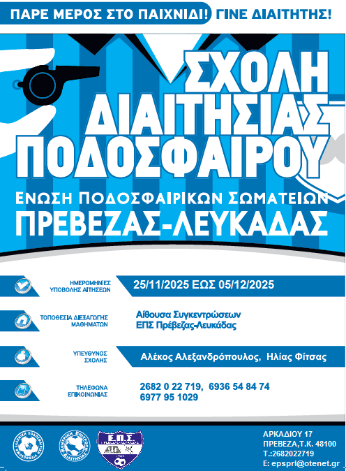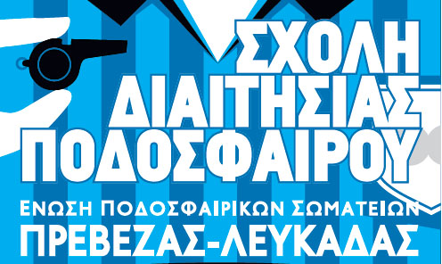 Η Ένωση Ποδοσφαιρικών Σωματείων Πρέβεζας– Λευκάδας ανακοινώνει τη δημιουργία  Νέας Σχολής Διαιτησίας Ποδοσφαίρου , καλώντας νέους και νέες που αγαπούν το ποδόσφαιρο να κάνουν το επόμενο βήμα και να μπουν δυναμικά στον κόσμο της διαιτησίας!