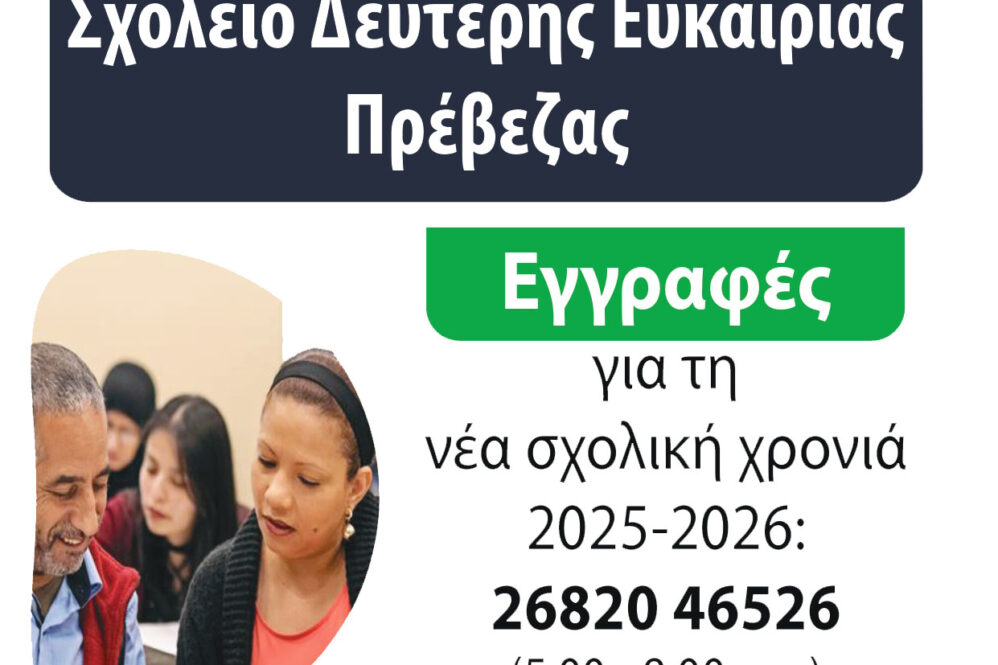 ΠΑΙΔΕΙΑ Πέμπτη 28 Αυγούστου 2025 - 20:06 Ξεκίνησαν οι ΕΓΓΡΑΦΕΣ ΣΤΟ ΣΧΟΛΕΙΟ ΔΕΥΤΕΡΗΣ ΕΥΚΑΙΡΙΑΣ ΠΡΕΒΕΖΑΣ για το σχολικό έτος 2025-2026 από ΟΜΑΔΑ ΣΥΝΤΑΞΗΣ Παρακαλώ αν μπορείτε ενημερώστε τους δημότες της πόλης έτσι ώστε να συμμετέχουν στο εξαιρετικά καινοτόμο πρόγραμμα ενός σχολείου ενηλίκωνΠληροφορίες για τις εγγραφές μπορείτε να βρείτε στους συνδέσμους του σχολείου (στέλνω και το πόστερ):https://sdeprevezas.wordpress.com/https://www.facebook.com/sdeprevezas/ ΠαιδείαΣχολείο Δεύτερης Ευκαιρίας