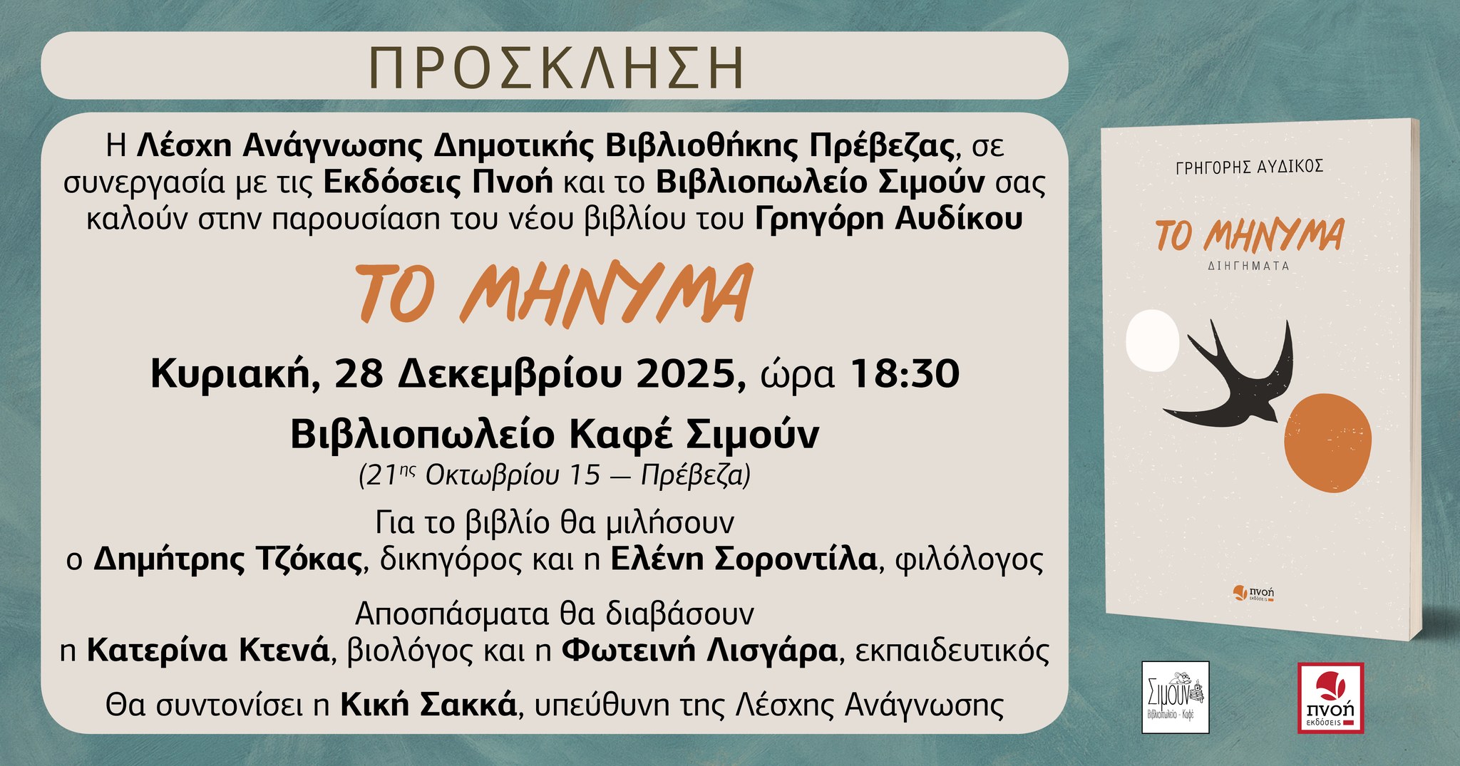 Η Λέσχη Ανάγνωσης Δημοτικής Βιβλιοθήκης Πρέβεζας, σε συνεργασία με τις Εκδόσεις Πνοή και το Βιβλιοπωλείο Σιμούν σας καλούν στην παρουσίαση του νέου βιβλίου του Γρηγόρη Αυδίκου